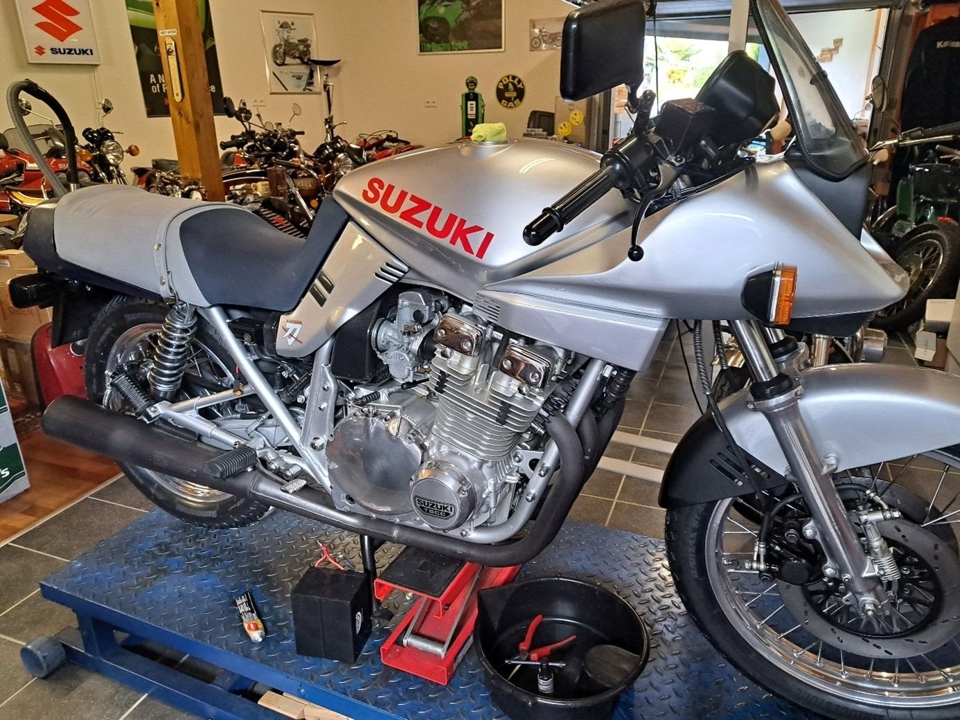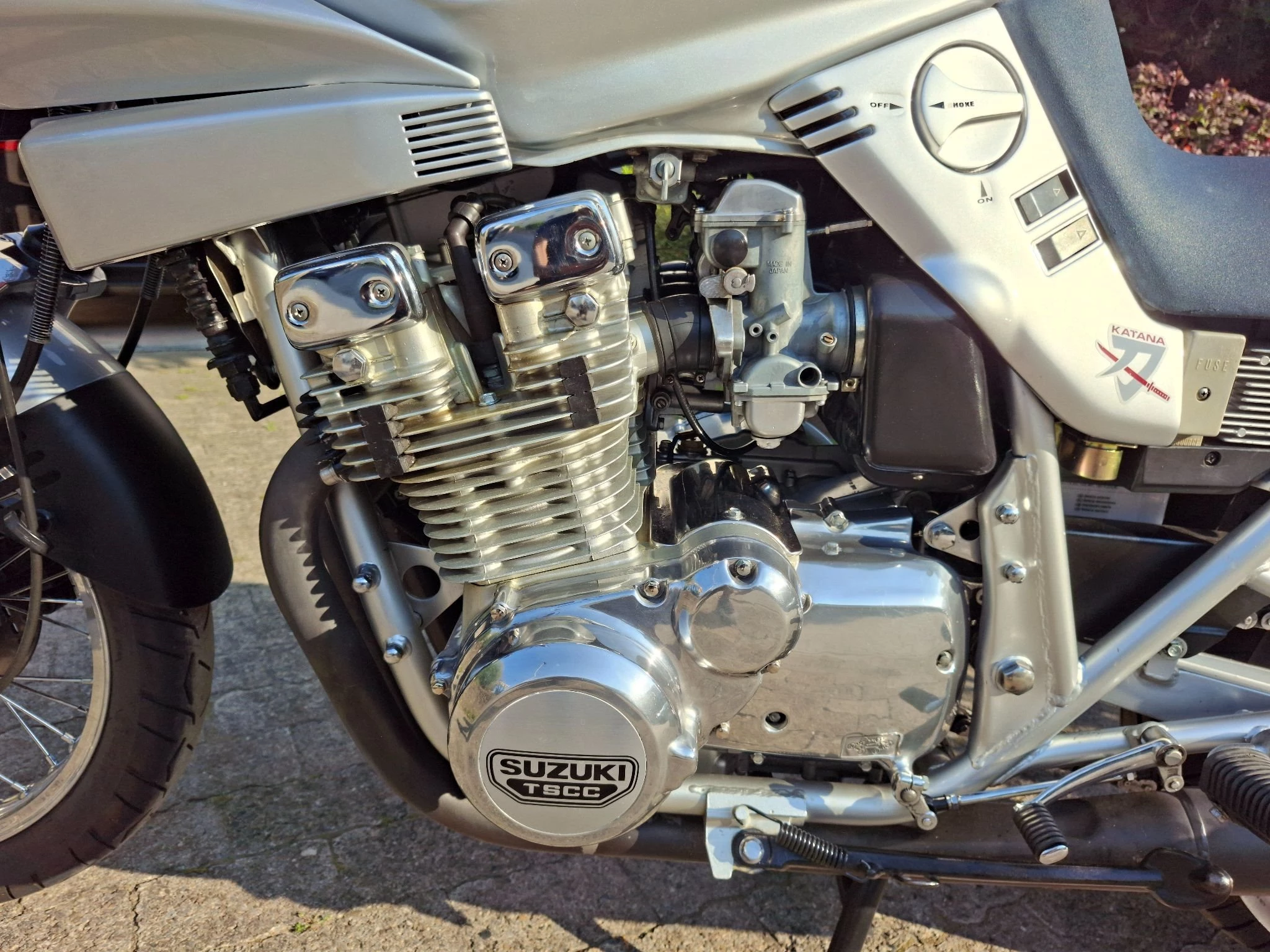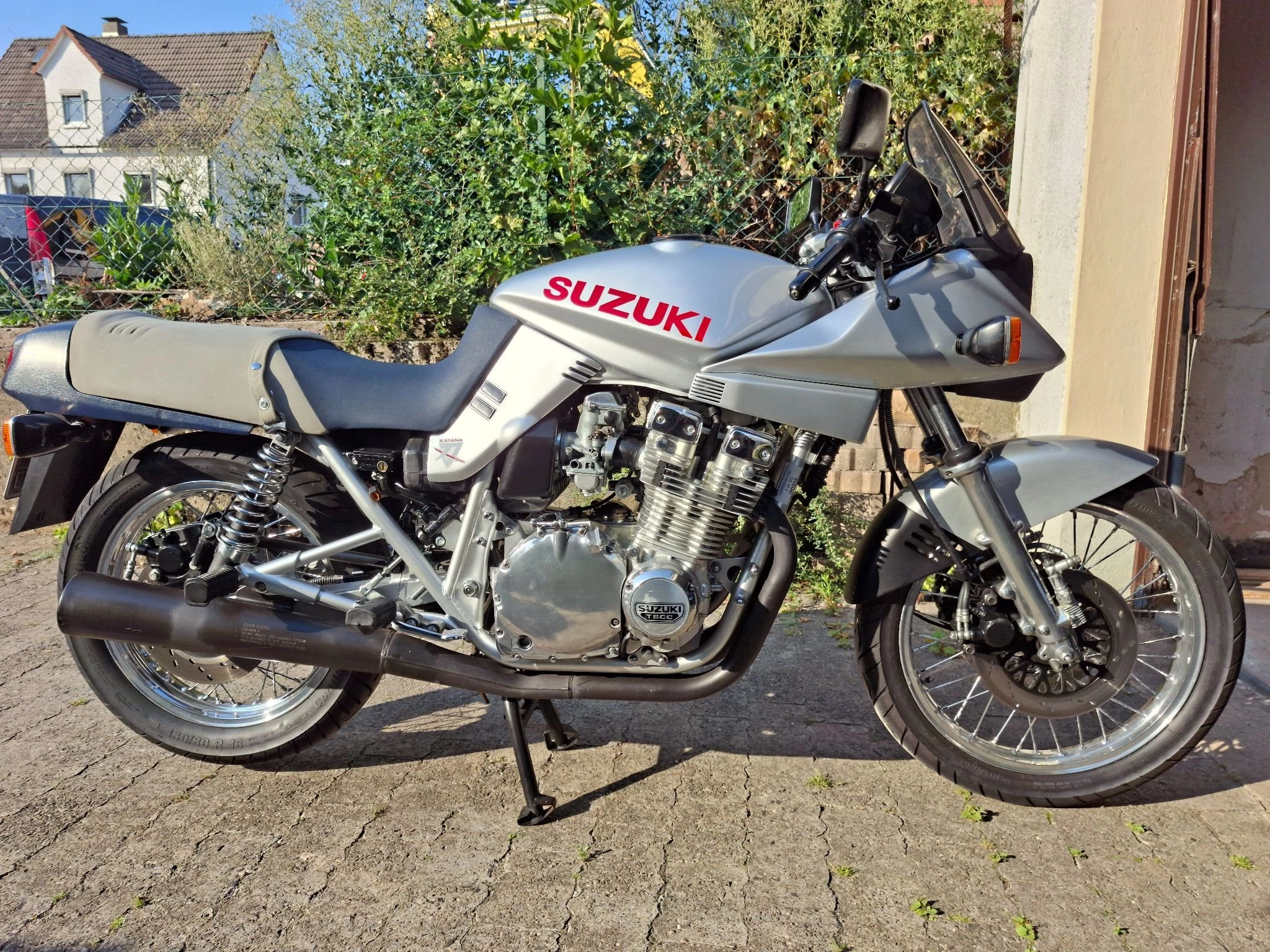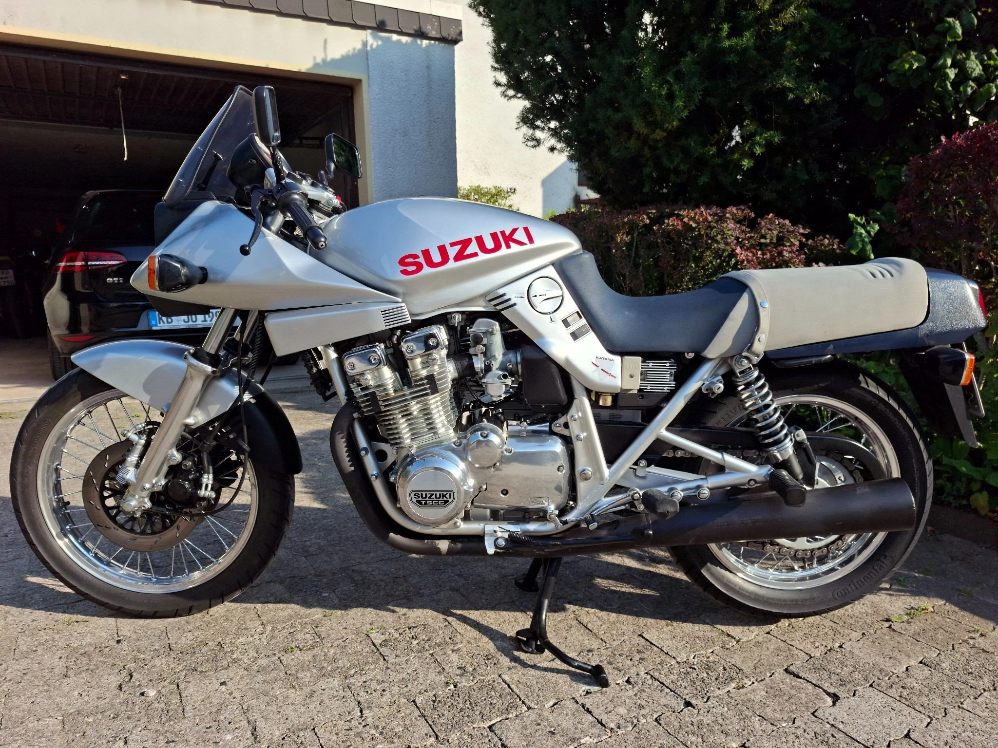 Keine 1100er, sondern die einzige in Deutschland zugelassene 1000er Katana. Es handelte sich um ein spezielles Rennhomologationsmodell für die USA, Australien usw. mit Rundschiebervergasern, 18-Zoll-Speichenrädern, anderen Nockenwellen und Verdichtung sowie Ölkühler. Concours-Zustand, komplett original.
