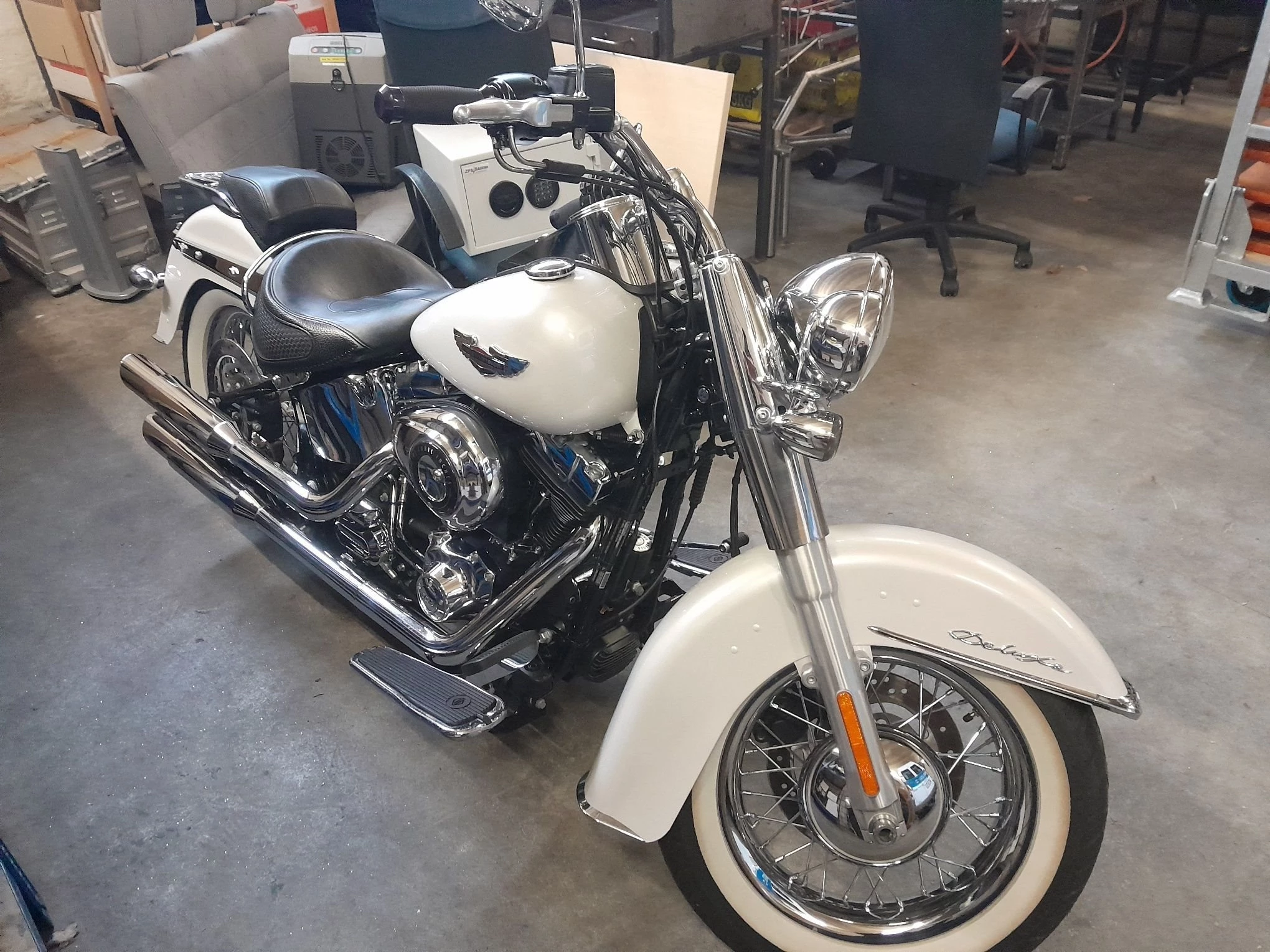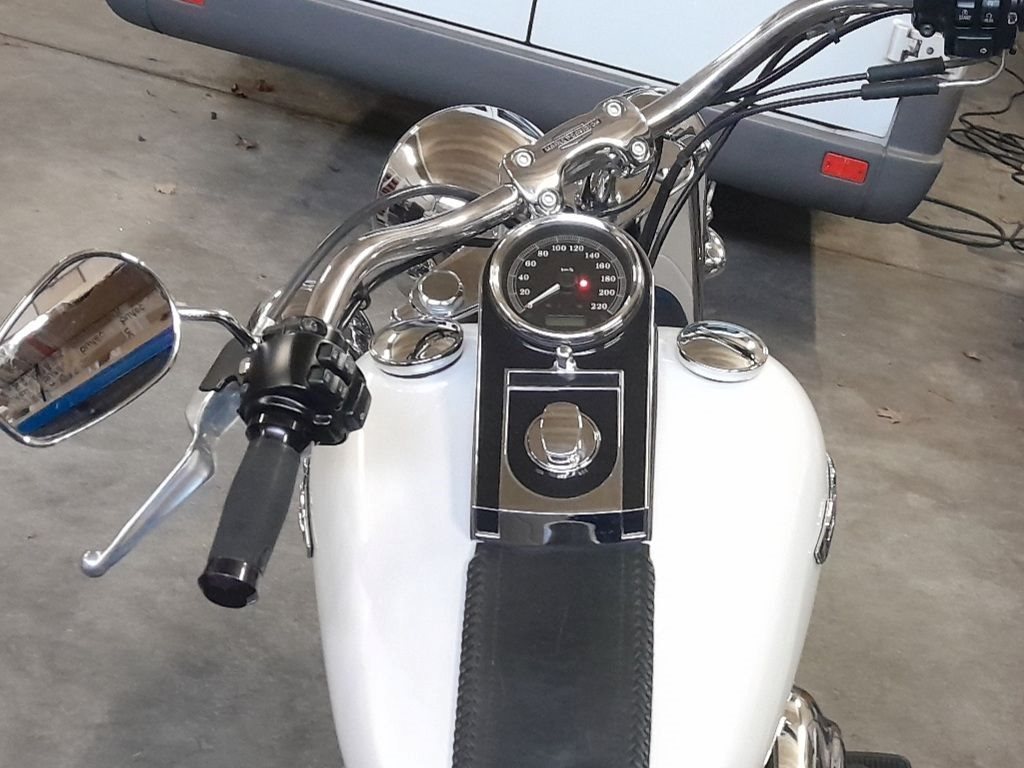 Verkaufe diese wunderschöne, gepflegte,un- bzw umfallfreie Softail Deluxe in einem tadellosen Zustand.Habe die Harley Davidson aus einer Sammlung heraus gekauft der alle Service und Wartungsarbeiten selbst durchgeführt hat(Harleymechaniker).Der Lack ist eine Art Perlmutt Weiß das im Licht einfach super aussieht. Leider ist das Serviceheft einem Brand zum Opfer gefallen, was mich jedoch nicht wirklich interessiert hat, bei der Laufleistung und dem Zustand. Batterie kann man nächstes Jahr mal tauschen, muß man (wenn sie am Refresher hängt)aber nicht zwingend. Tüv wurde im Okt.ohne Reklamationen erteilt.