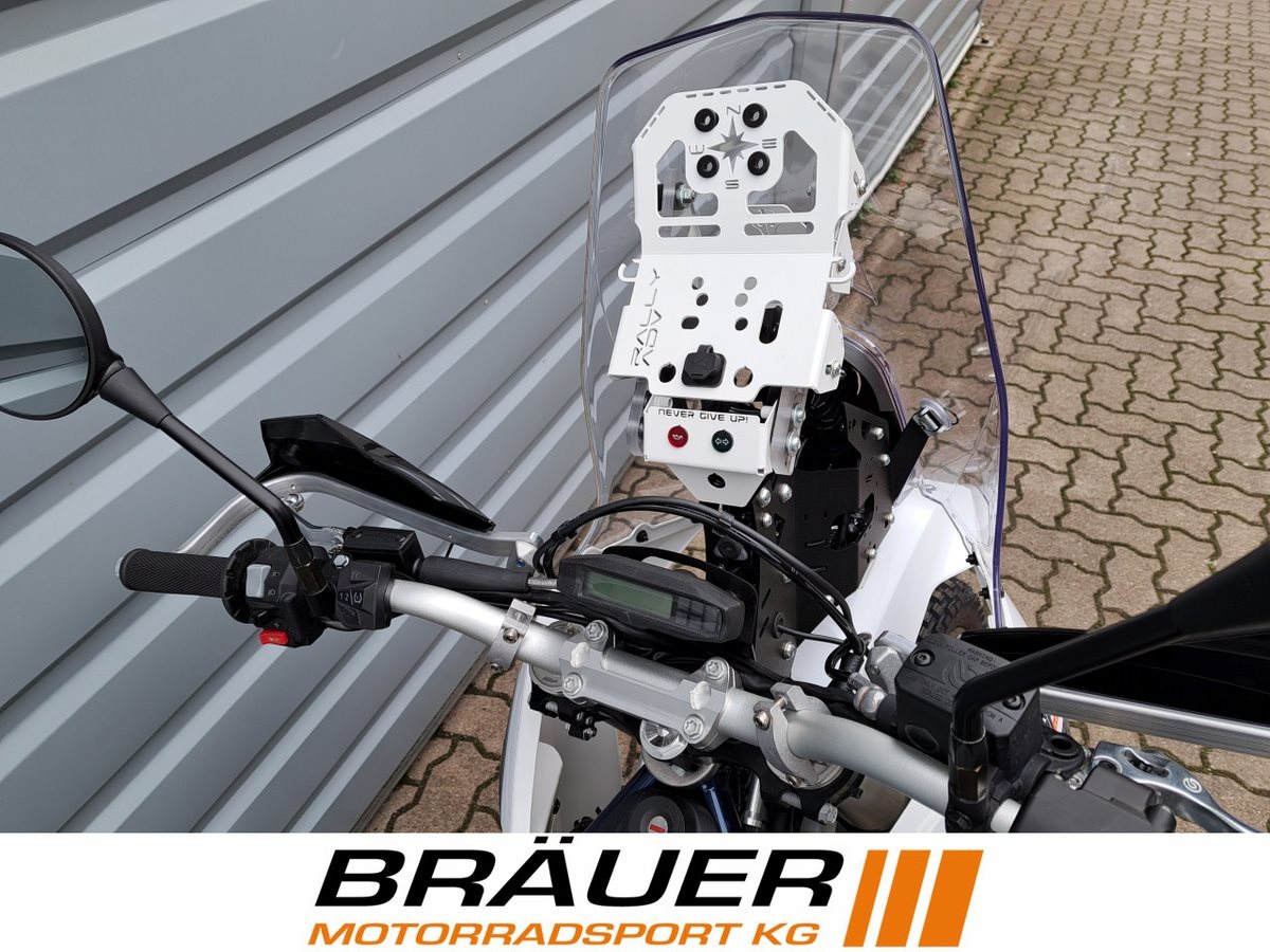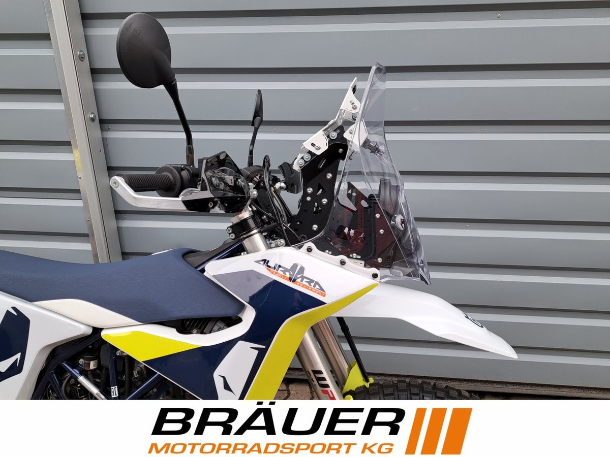 Rally Umbau auf Basis der Husqvarna 701 Enduro mit einem Aurora Rally Lite Kit. Inklusive TÜV Abnahme. Windschild und Scheinwerfer der Husqvarna Factory Replica Rally. Guter Windschutz, viel Platz für Zusatzinstrumente und mehr Licht, dazu der einmalige Rally Look. Aluminium Handguards für optimalen Schutz der Hände und Lenkerarmaturen.