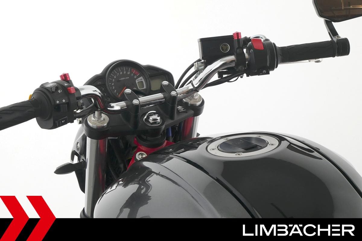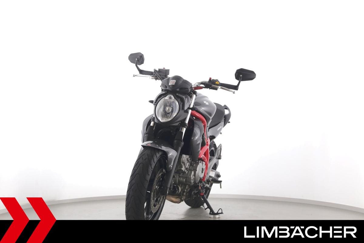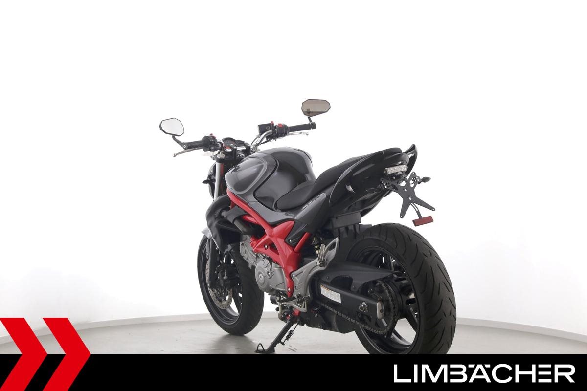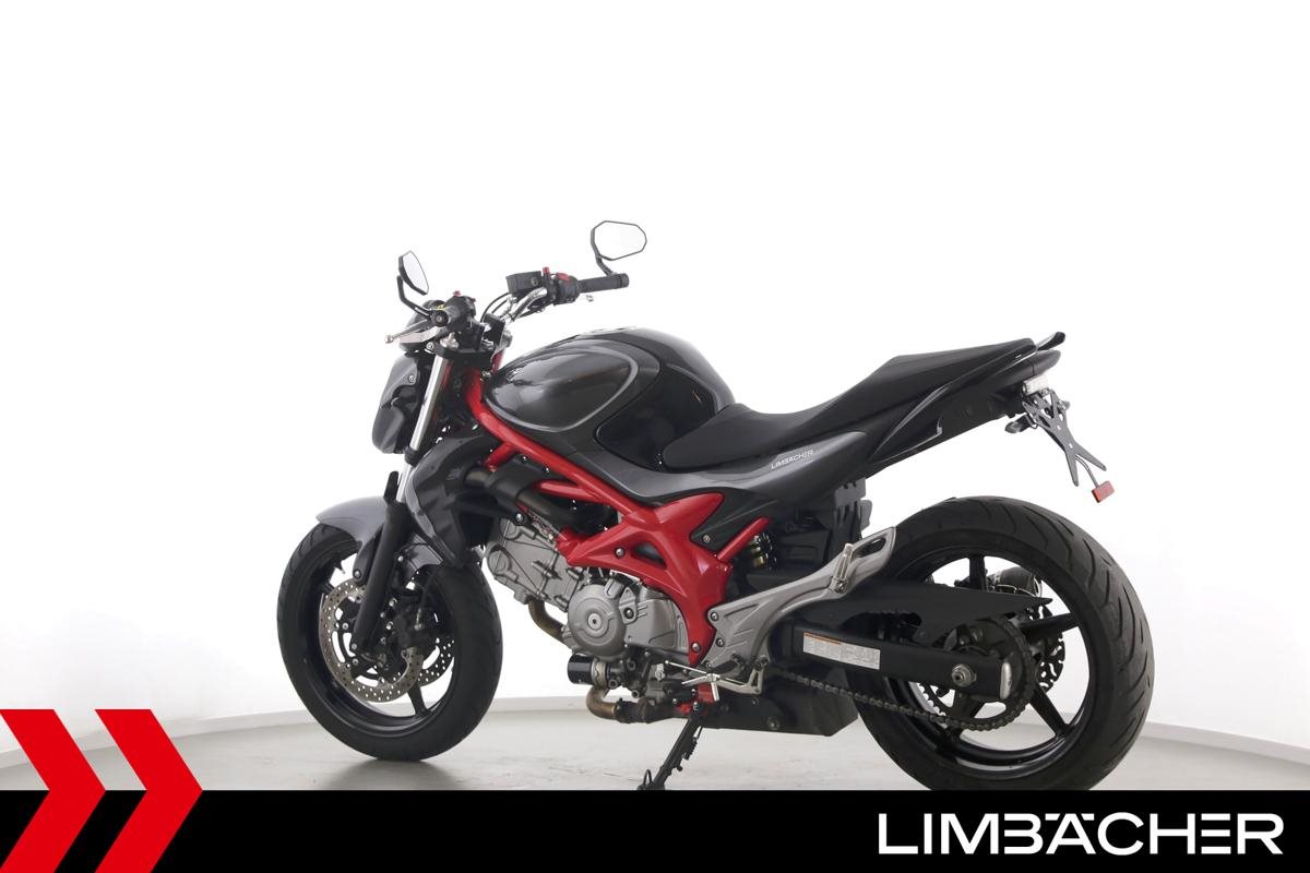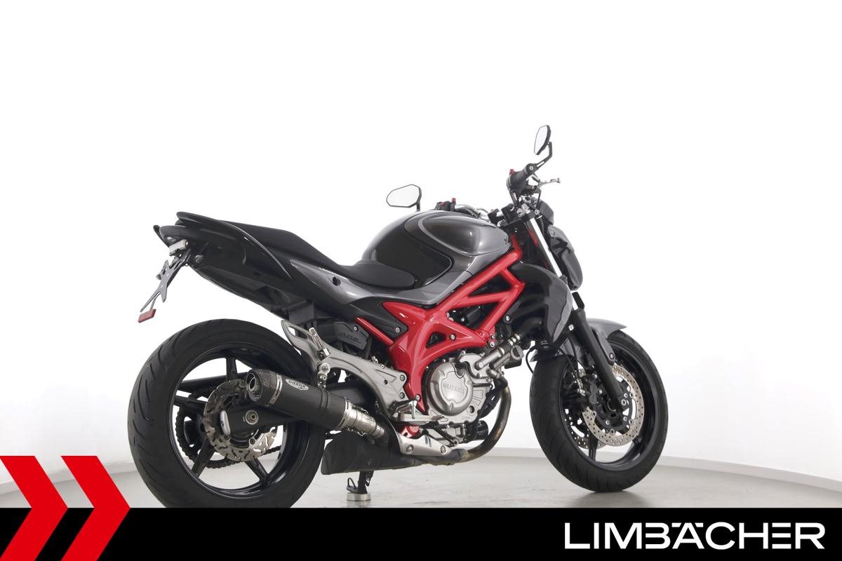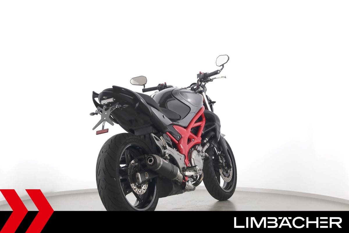 Eine scheckheftgepflegte Suzuki SFV 650 Gladius aus zweiter Hand in gepflegtem Zustand u.a. mit Tieferlegung und Shark-Carbon-Endschalldämpfer.