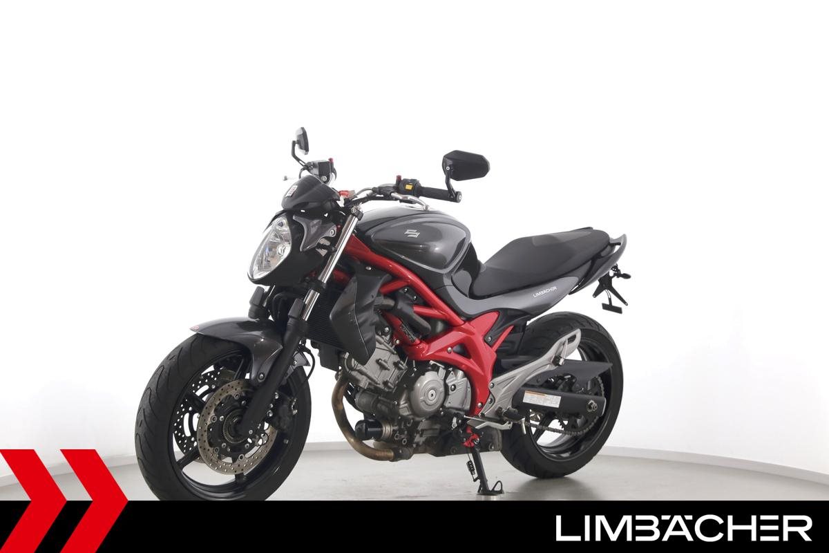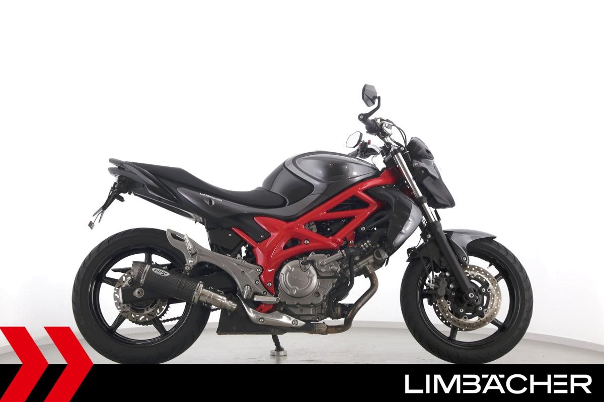 Eine scheckheftgepflegte Suzuki SFV 650 Gladius aus zweiter Hand in gepflegtem Zustand u.a. mit Tieferlegung und Shark-Carbon-Endschalldämpfer.