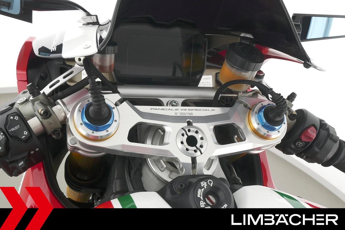 Eine scheckheftgepflegte Ducati Panigale V4 Speciale aus zweiter Hand in gepflegtem Zustand u.a. mit Öhlins-Fahrwerk sowie transparentem Kupplungsdeckel.