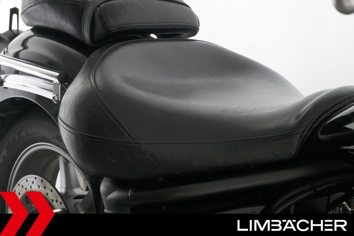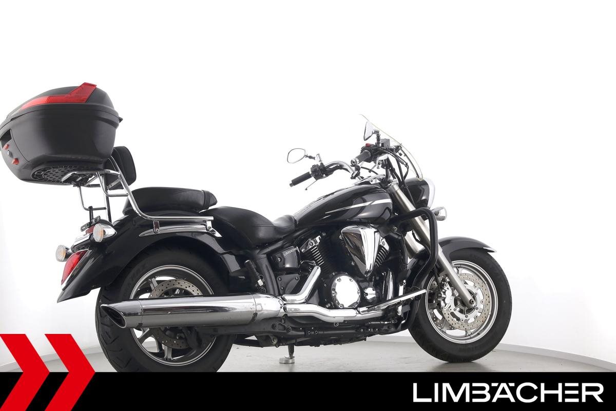 Eine Yamaha XVS 1300 A Midnight Star in gebrauchtem Zustand u.a. mit Topcase und Sissybar.