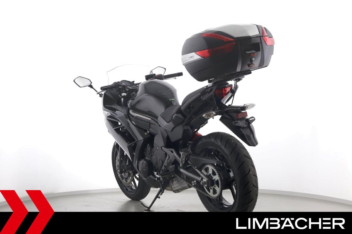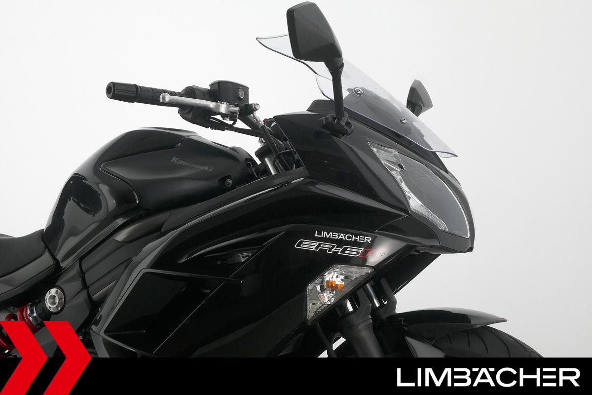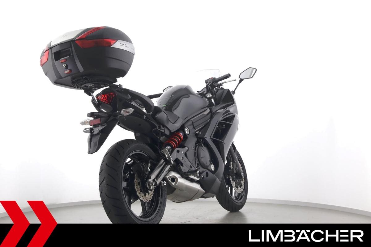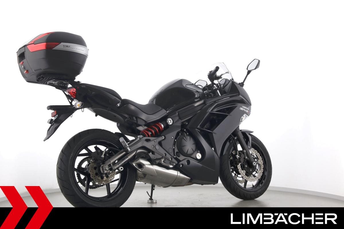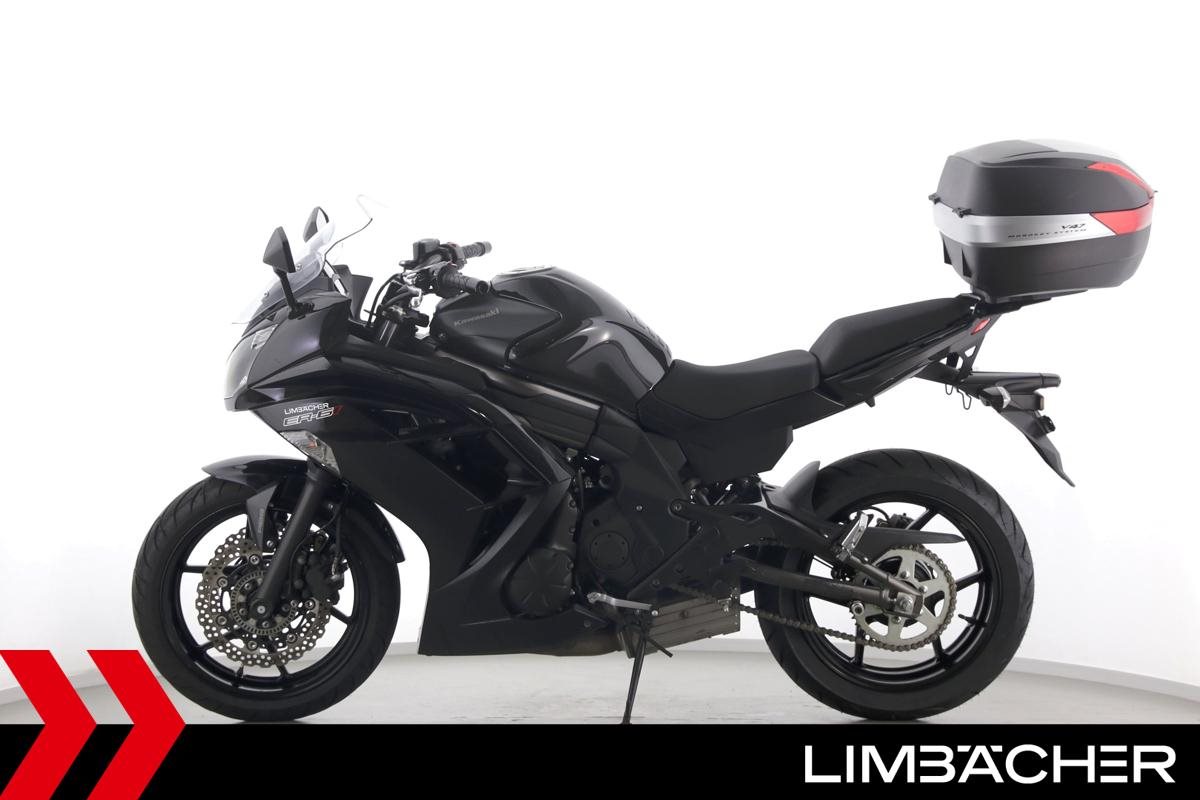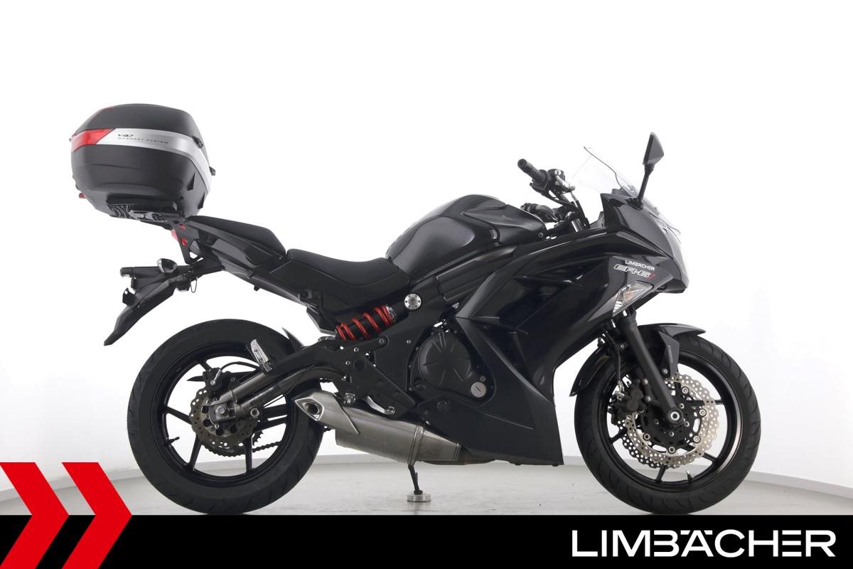 Eine scheckheftgepflegte Kawasaki ER-6f aus zweiter Hand in gepflegtem Zustand u.a. mit grossem Givi-Topcase und Montageheber-Aufnahmen.