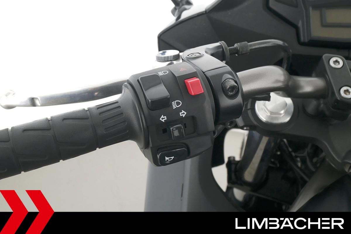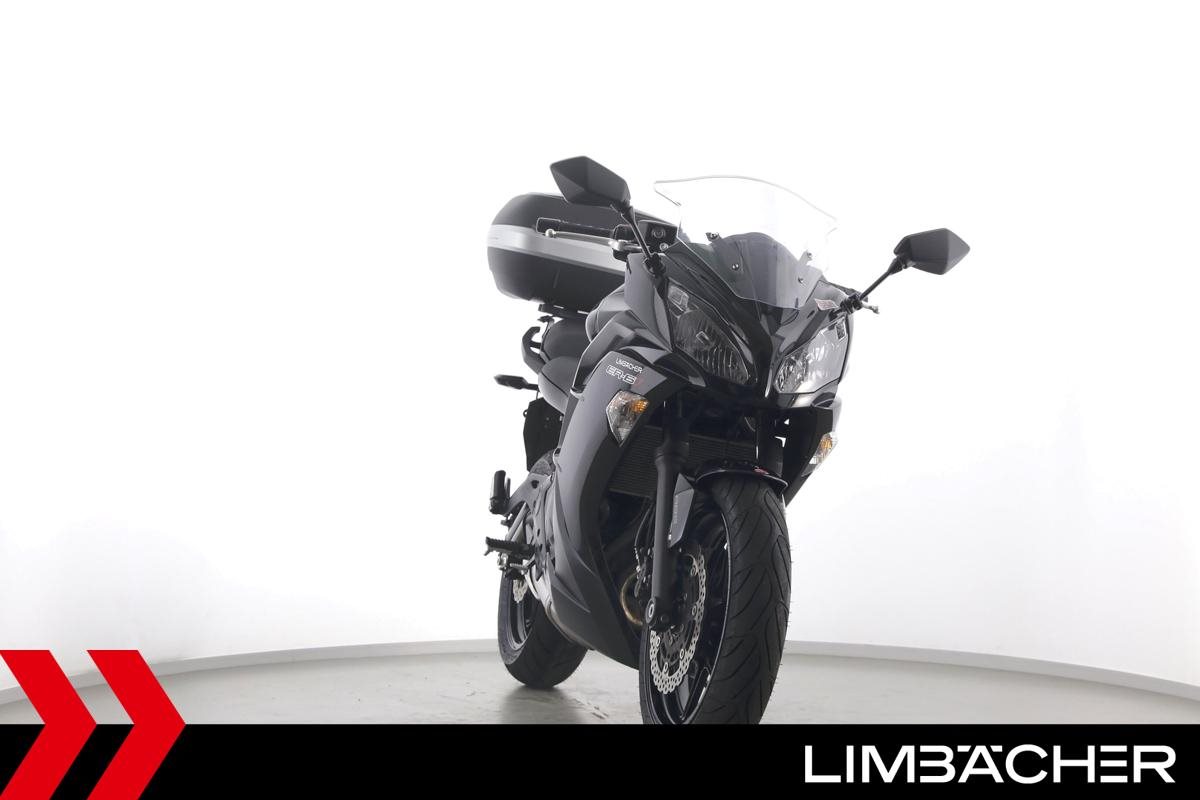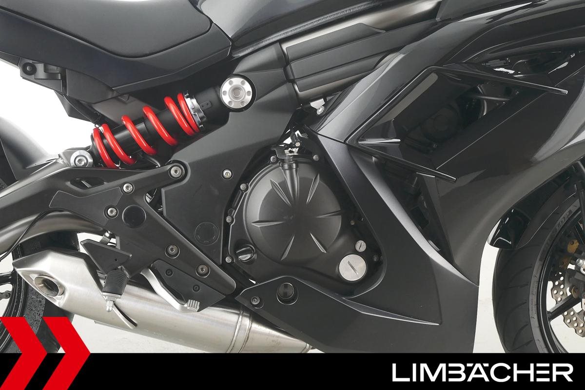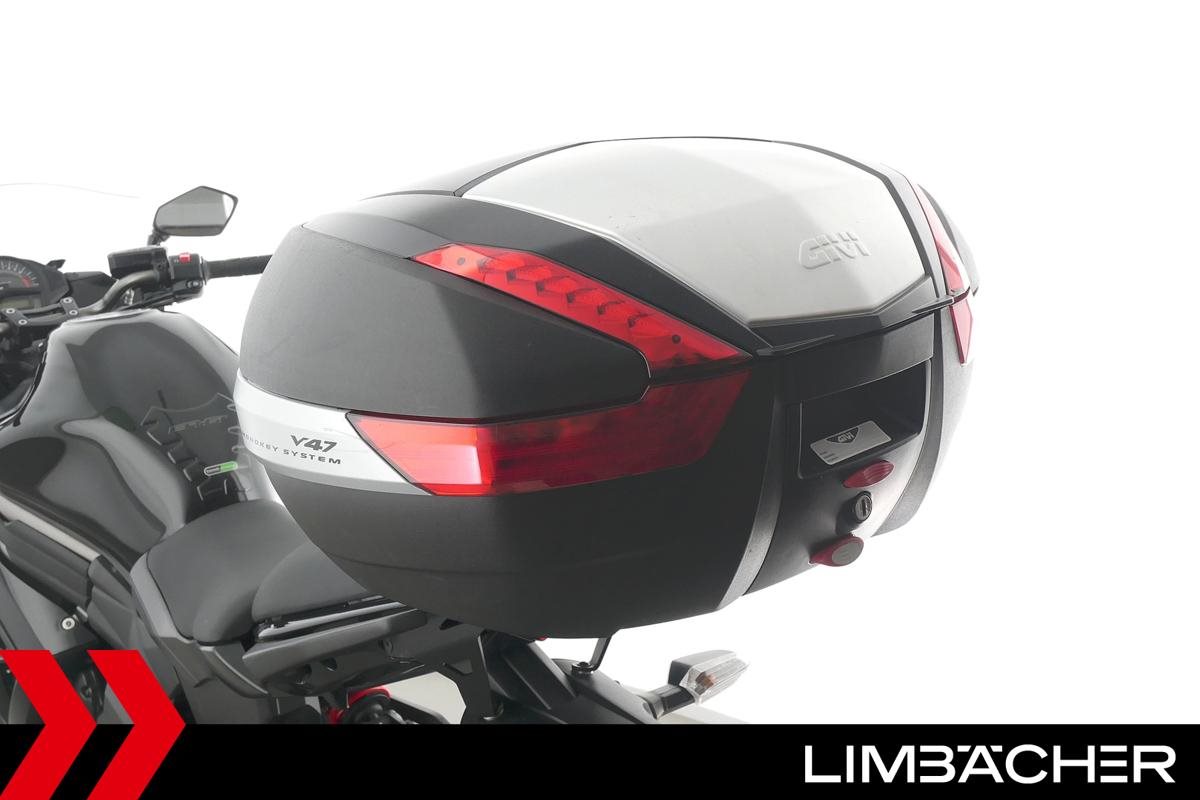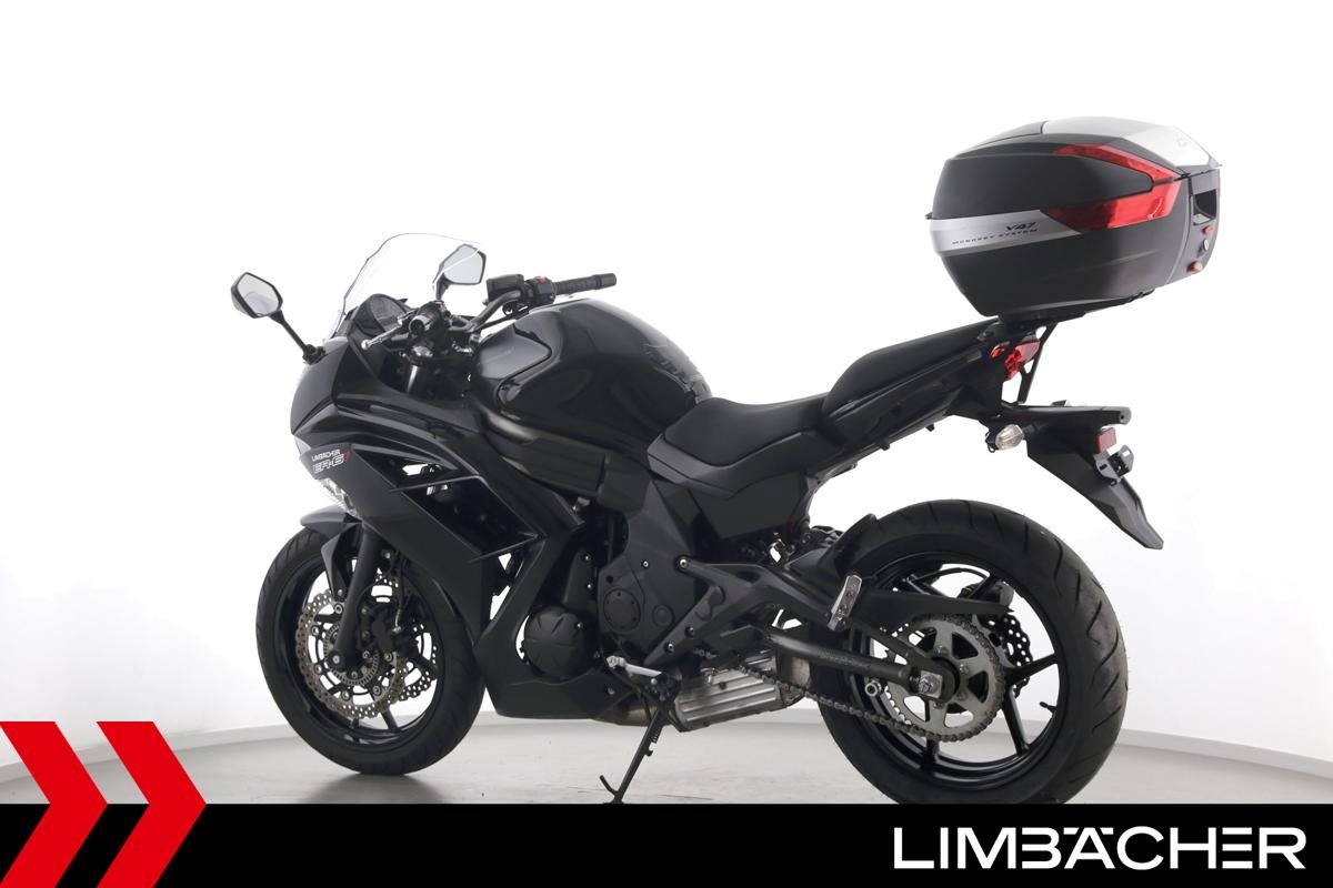 Eine scheckheftgepflegte Kawasaki ER-6f aus zweiter Hand in gepflegtem Zustand u.a. mit grossem Givi-Topcase und Montageheber-Aufnahmen.