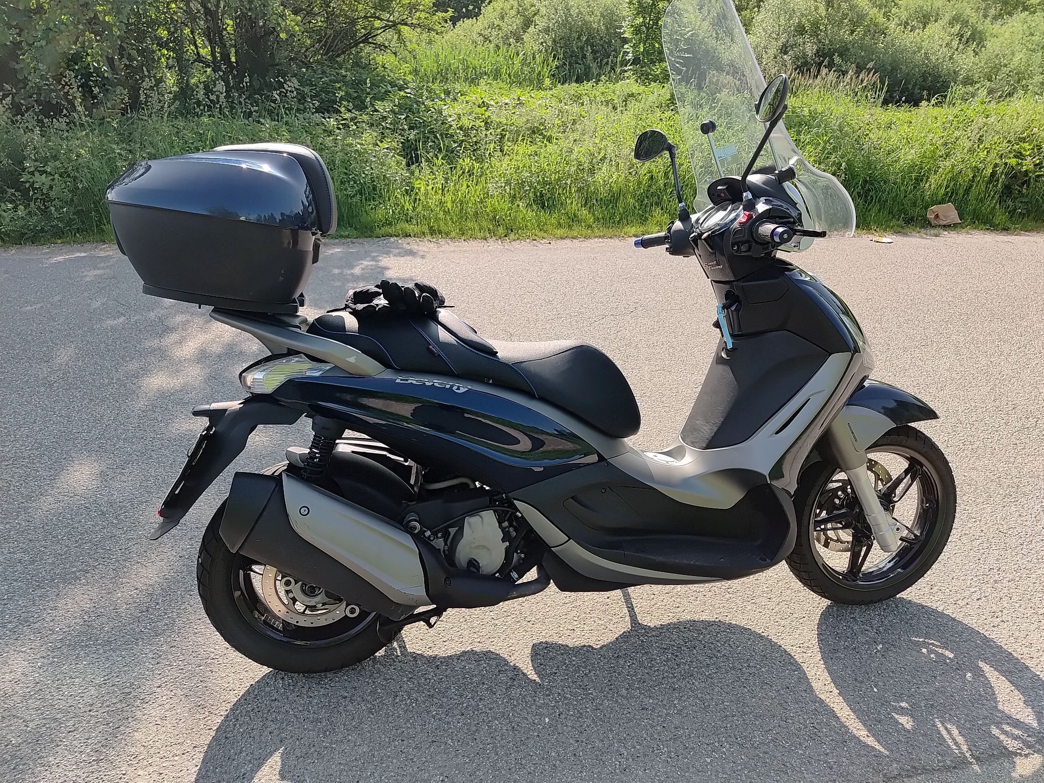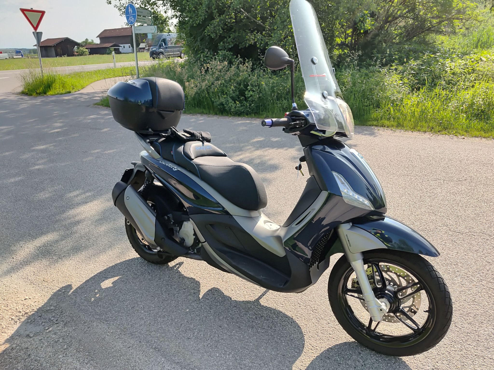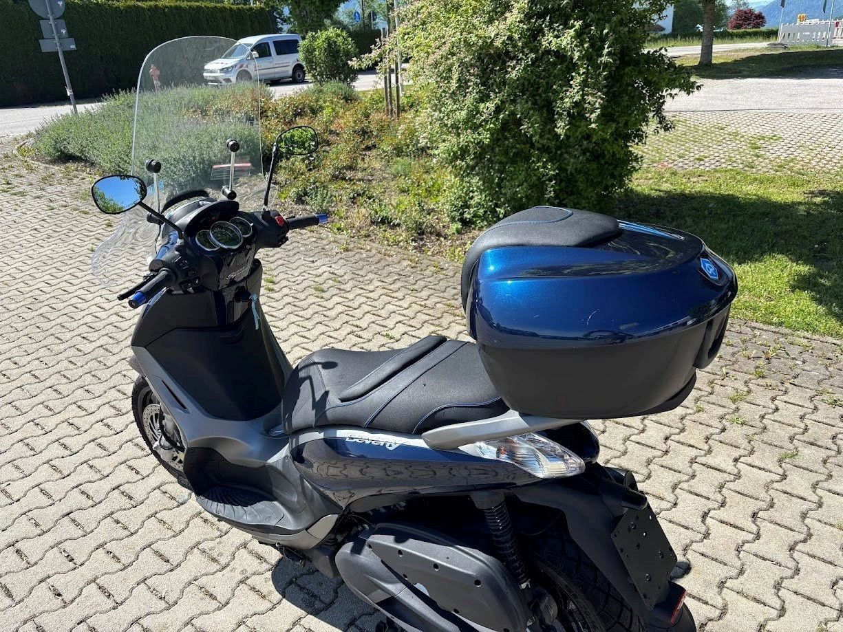 hohes Windschild, Piaggio Topcase, USB-Anschluss, Griffheizung