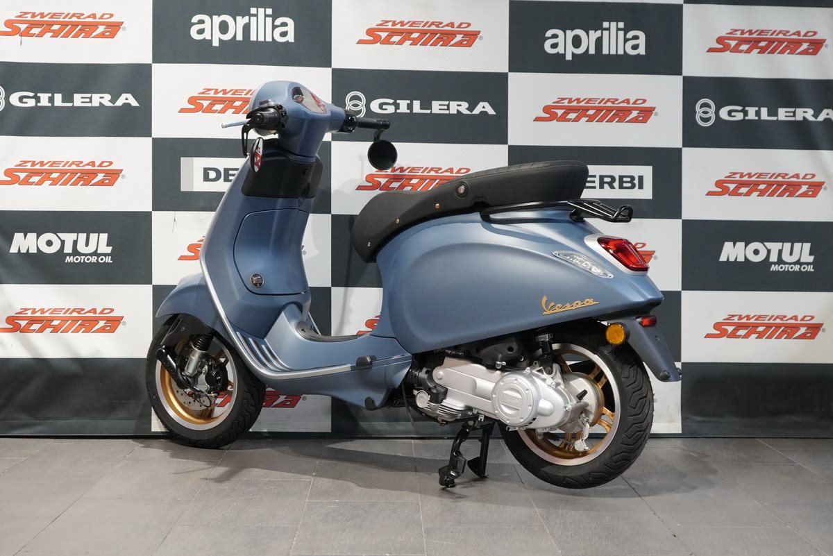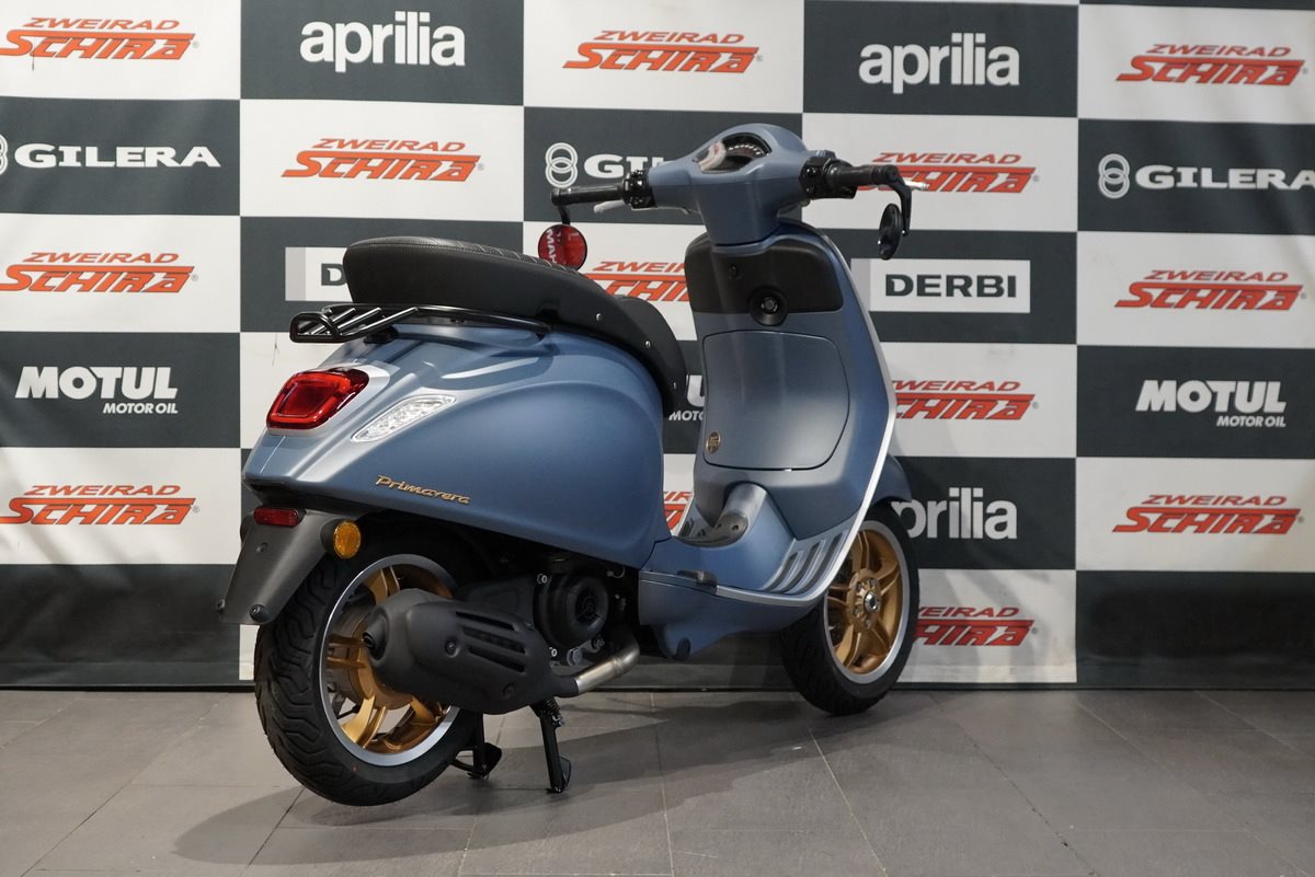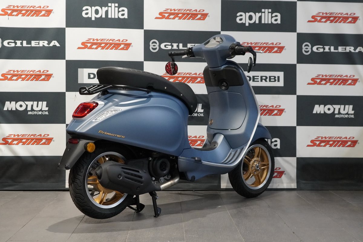 Die Vespa Primavera Officina 8 bringt das Erbe der Vespa mit Eleganz und einem modernen Touch neu auf die Straße. Die intensive blaue Lackierung ist von den Industriemaschinen in der historischen Werkstatt 'Officina 8' des Piaggio Werks inspiriert. Eine Hommage an die Tradition, die zu einem unverwechselbaren Symbol für Stärke und Identität geworden ist. Die metallenen Details, die polierten Messingnieten und die Kontrastnähte auf dem Sattel zeugen von der Genialität, Sorgfalt und Leidenschaft, die Vespa seit jeher auszeichnet.