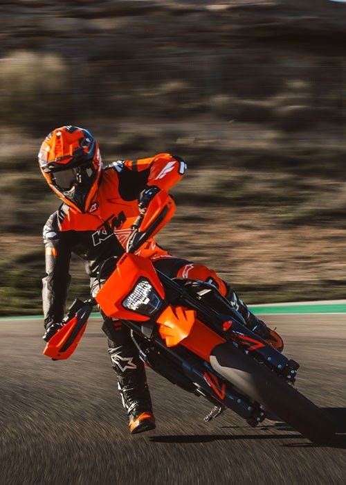 Die KTM 690 SMC R setzt sich gegen die Konkurrenz durch und erweist sich als unangefochtener König ihrer Klasse. Die KTM 690 SMC R bietet dem Fahrer ein agiles Handling, klassenbeste Leistung und eine auf den Fahrer ausgerichtete Ergonomie und verkörpert den Begriff READY TO RACE mit 110% Hingabe zu ihrem Handwerk. Ob beim Rutschen in die Kurven, bei Power-Wheelies über Kuppen oder bei harten Sprüngen durch enge Bergpässe - der König der Supermoto für die Street greift an.