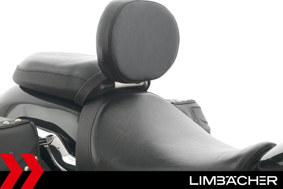 Eine Yamaha XVS 950 A Midnight Star aus zweiter Hand in gepflegtem Zustand mit Hepco&Becker-Packtaschensystem und Rückenlehne.