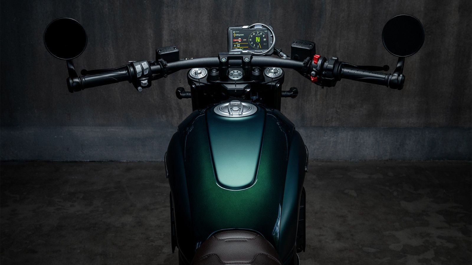 Die Scrambler Nightshift ist mit einem geraden Lenker und eleganten Café-Racer-Lenkerendenspiegeln ausgestattet.