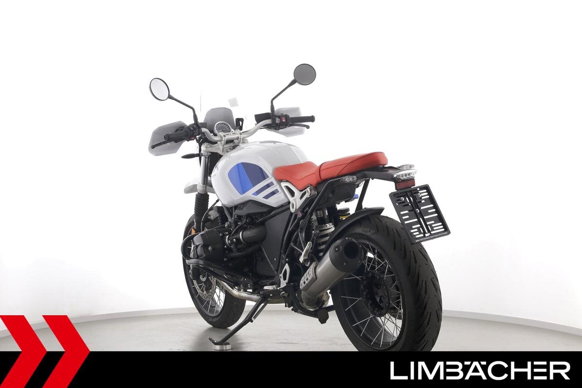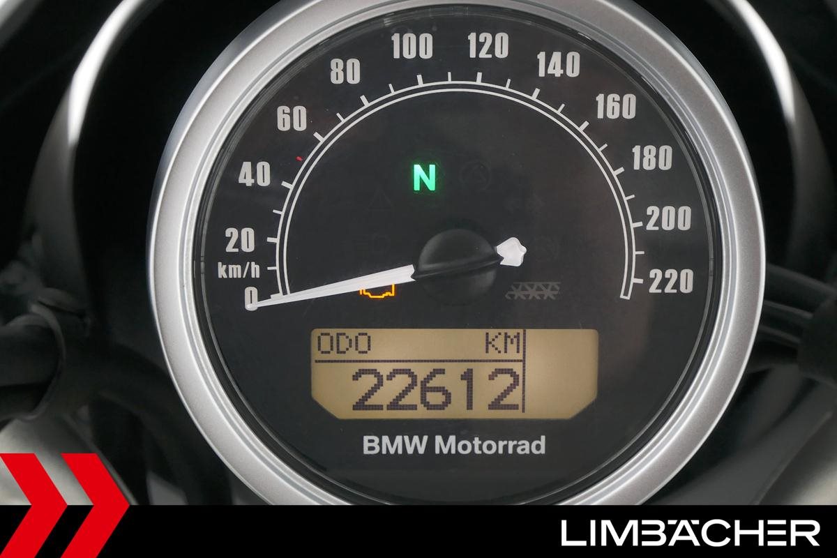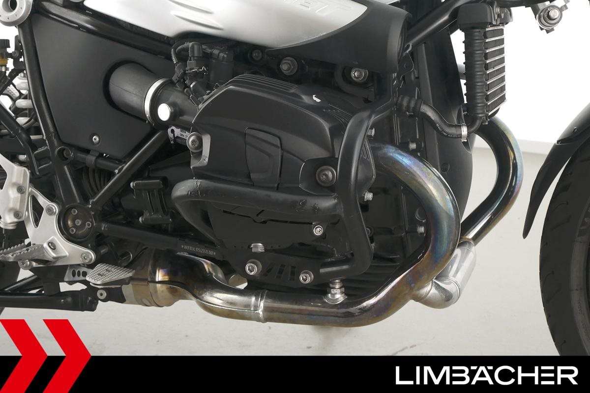 Eine scheckheftgepflegte BMW R nineT in gepflegtem Zustand u.a. mit Sturzbügeln und Scheibe.