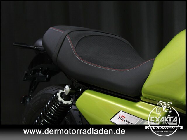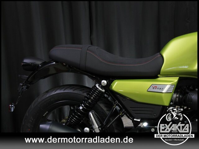 Die Moto Guzzi V7 Sport zeichnet sich unter anderem durch doppelte Scheibenbremsen an der Vorderachse, eine Upside-Down-Gabel sowie durch die IMU mit Kurven-ABS und einen individuell gestaltbaren Sport-Fahrmodus aus.