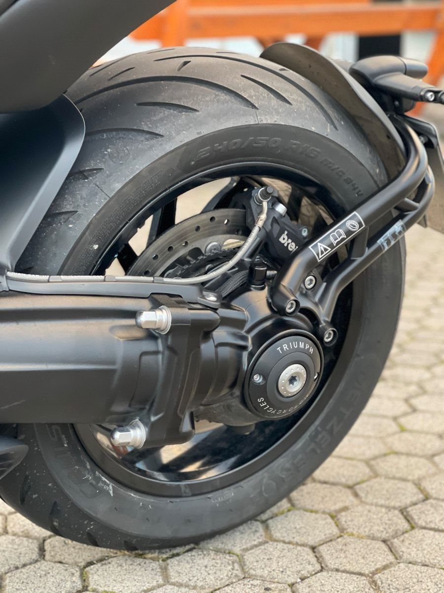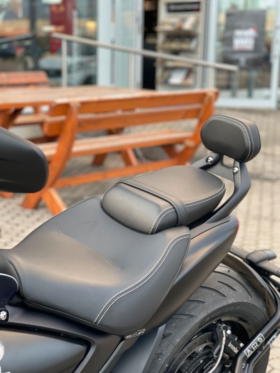 Rocket 3 Storm GT mit Rückenlehne, vorverlegte Rasten ab Werk und Tourenlenker sowie Scheibe.