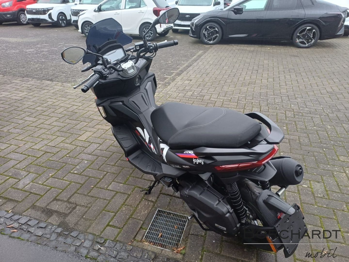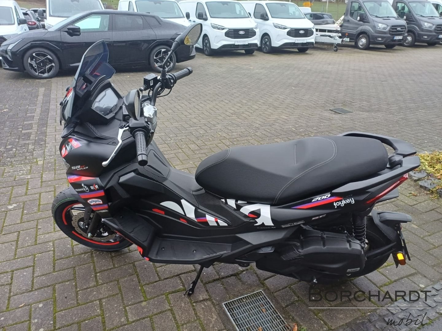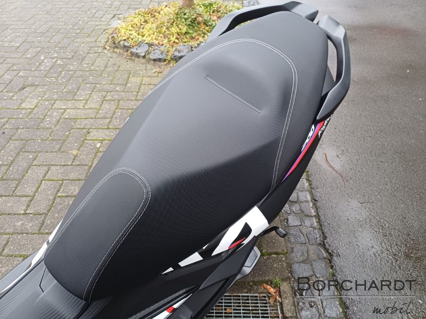 Beschleunige den SpaßErgänzt wird das robuste Fahrwerk der Aprilia SR GT Replica durch Reifen mit sportlichem Straßenprofil und schwarzen Felgen, wobei die vordere Felge mit roten Decals verziert ist. Ein Roller, der dafür gemacht ist, den Rhythmus der Stadt voll auszukosten.