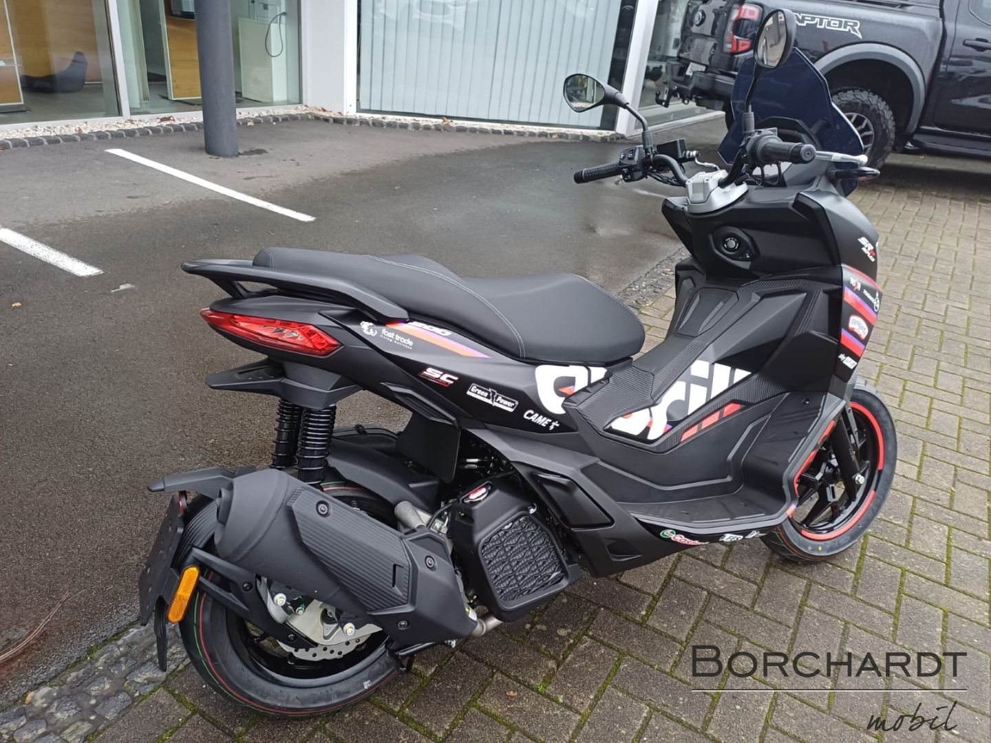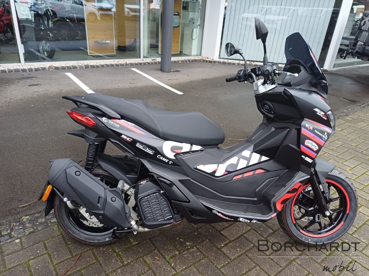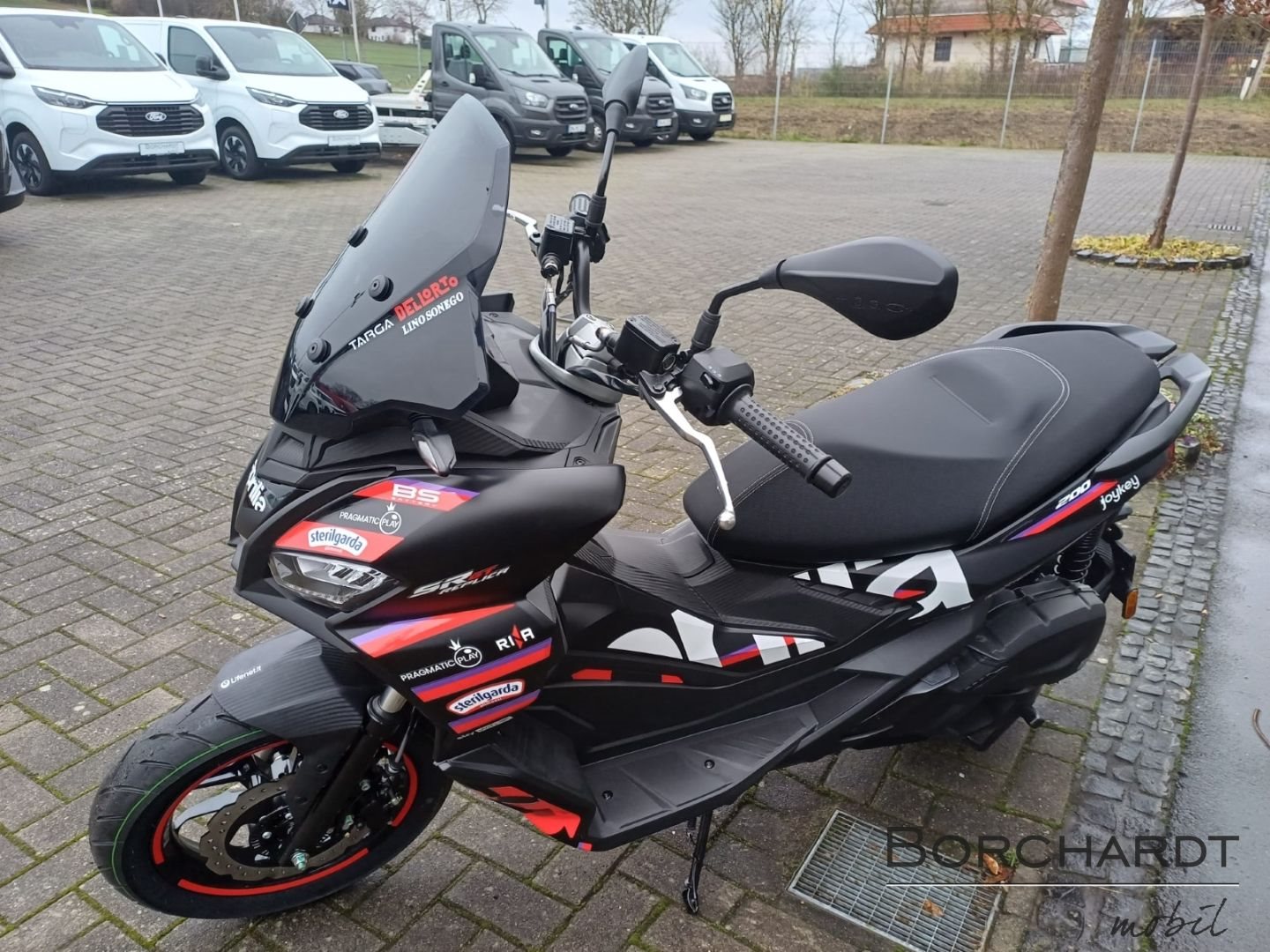 MotoGP-StilDie Sonderedition Replica zeigt stolz ihre vom Rennsport inspirierten Referenzen. Mit seiner auffälligen Optik, die sich durch eine mattschwarze Verkleidung mit roten und violetten Grafikelementen auszeichnet, macht der SR GT keinen Hehl daraus, dass er von der RS-GP25 inspiriert ist. Der Soziusgriff und der Spoiler sind ebenfalls in Mattschwarz gehalten, während das ikonische Aprilia Logo an der Seite prangt.