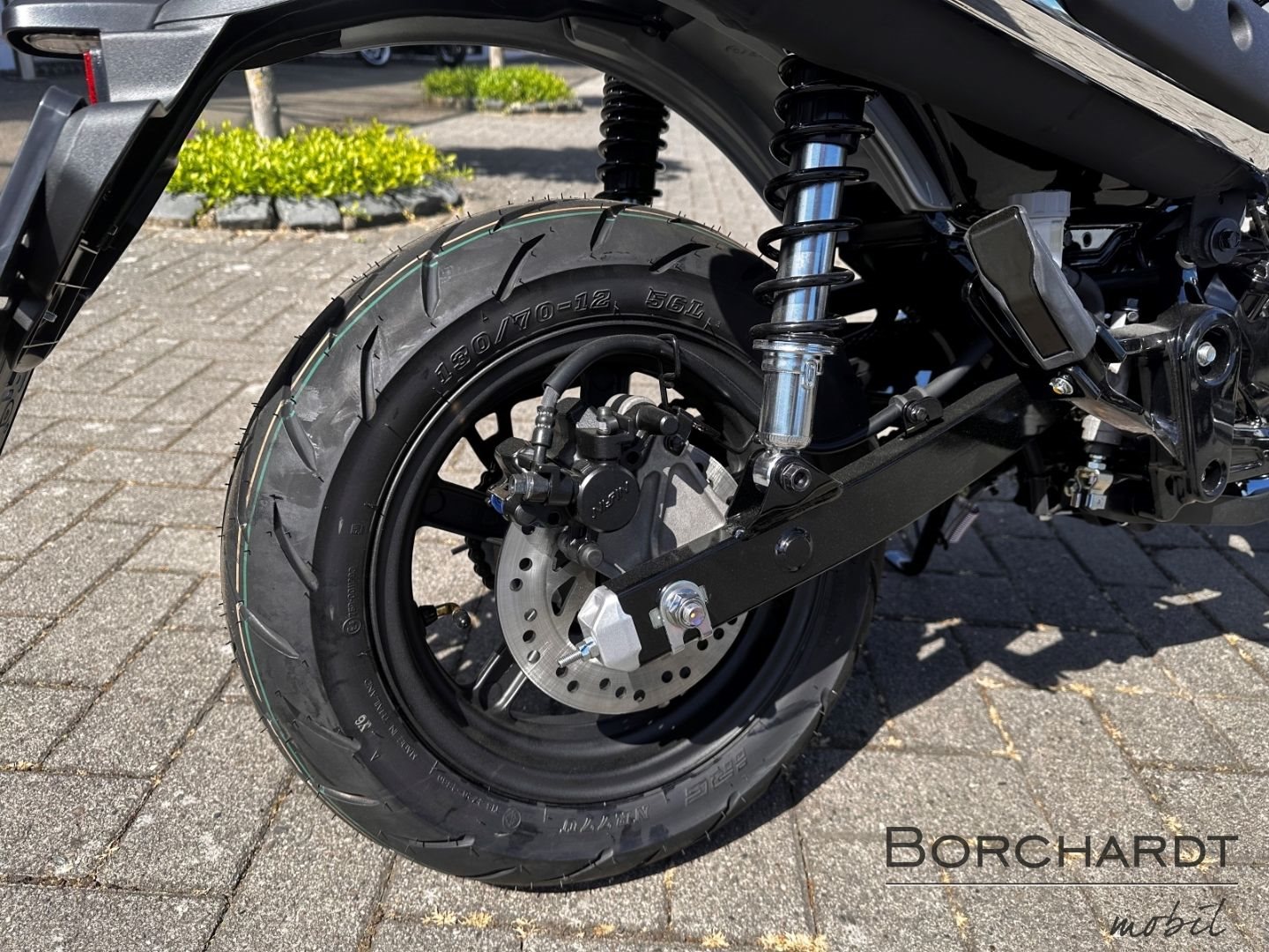 Breitreifen für jederzeit herausragende TraktionDas robuste Mini-Motorrad kommt mit passenden breiten Reifen - 120mm vorn und 130mm hinten -, die auch auf schwierigem Untergrund für sicheren Grip sorgen.