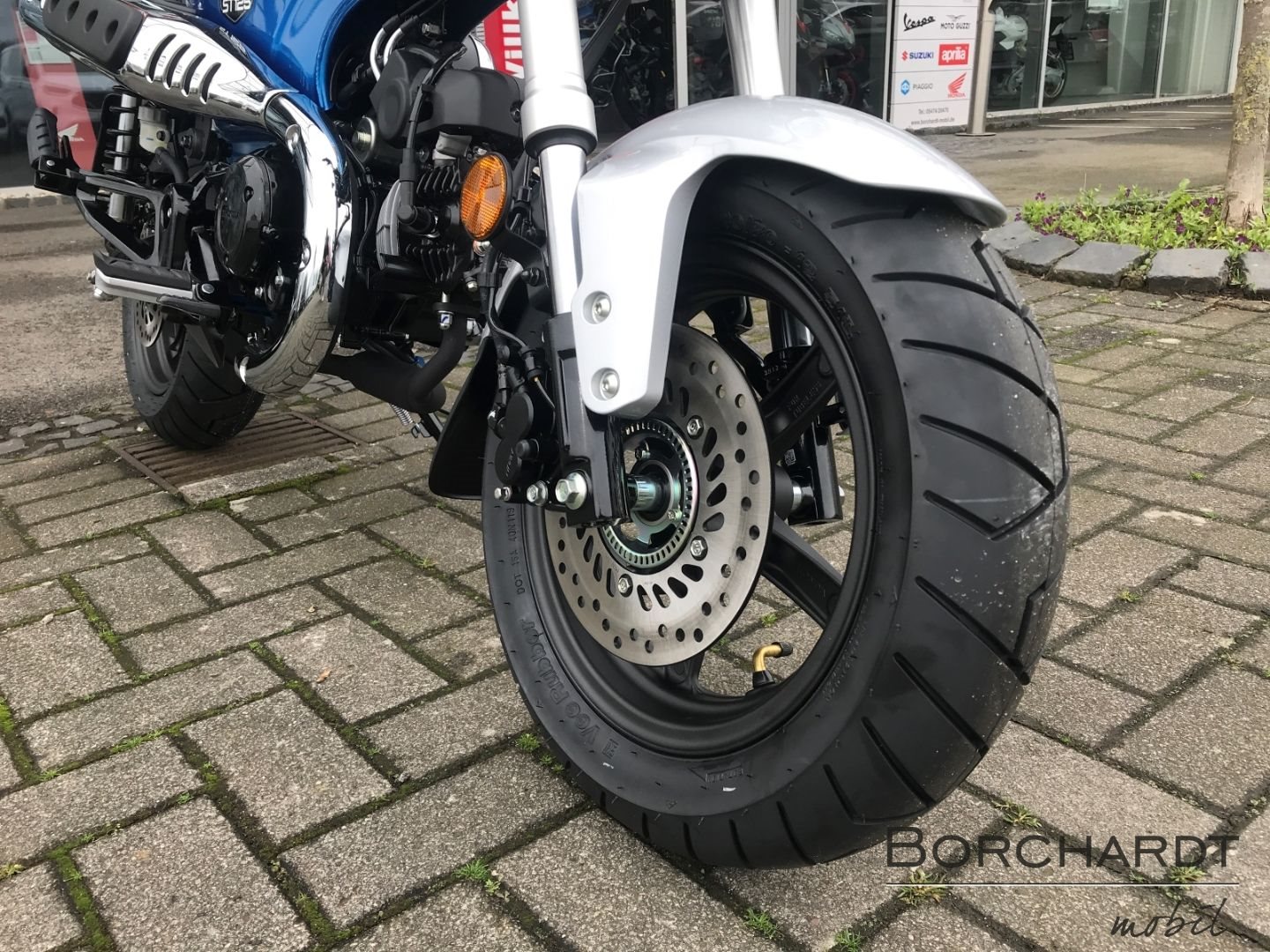 Echter Retro-CharmeWie die Dax zu ihrem Namen kam? Den verdankt sie dem T-förmigen Rahmen aus gewalztem Stahl, der an die Silhouette eines Dachshunds (Dackels) erinnert. Er wurde mit dem technischen Know-how des 21. Jahrhunderts konstruiert, hält eine Menge aus und sieht toll aus. Das unverwechselbare, charmante Design bleibt jedoch bis ins kleinste Detail erhalten, vom hohen Mini-Ape-Lenker und dem nach oben weisenden Offroad-inspirierten Auspuff bis hin zur Doppelsitzbank.