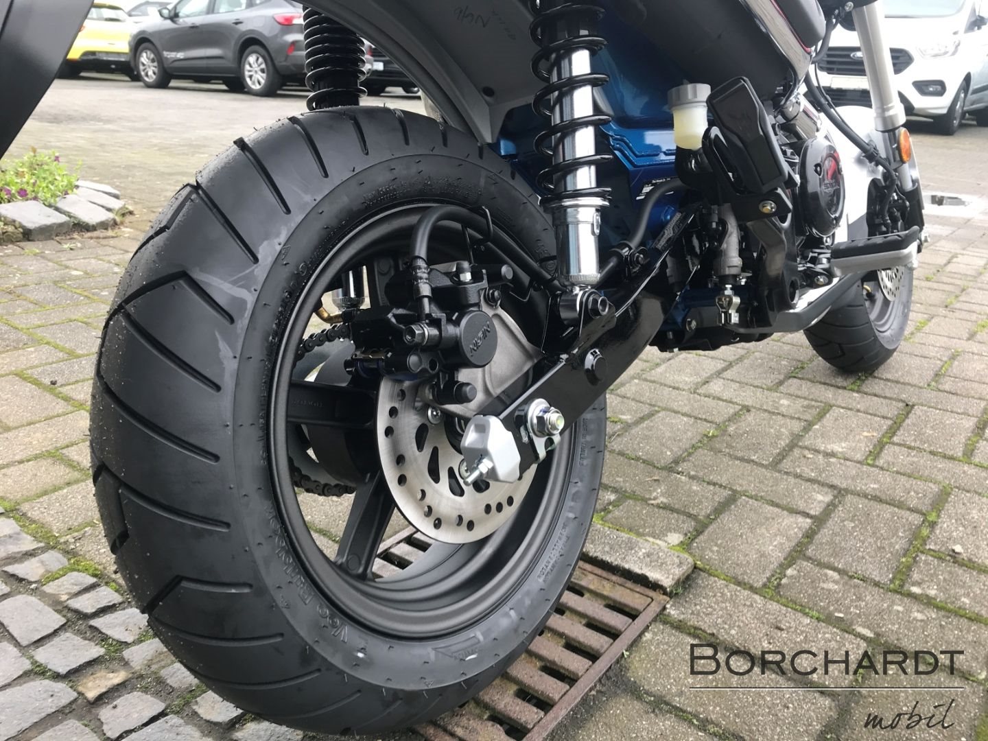 Breitreifen für jederzeit herausragende TraktionDas robuste Mini-Motorrad kommt mit passenden breiten Reifen - 120mm vorn und 130mm hinten -, die auch auf schwierigem Untergrund für sicheren Grip sorgen.