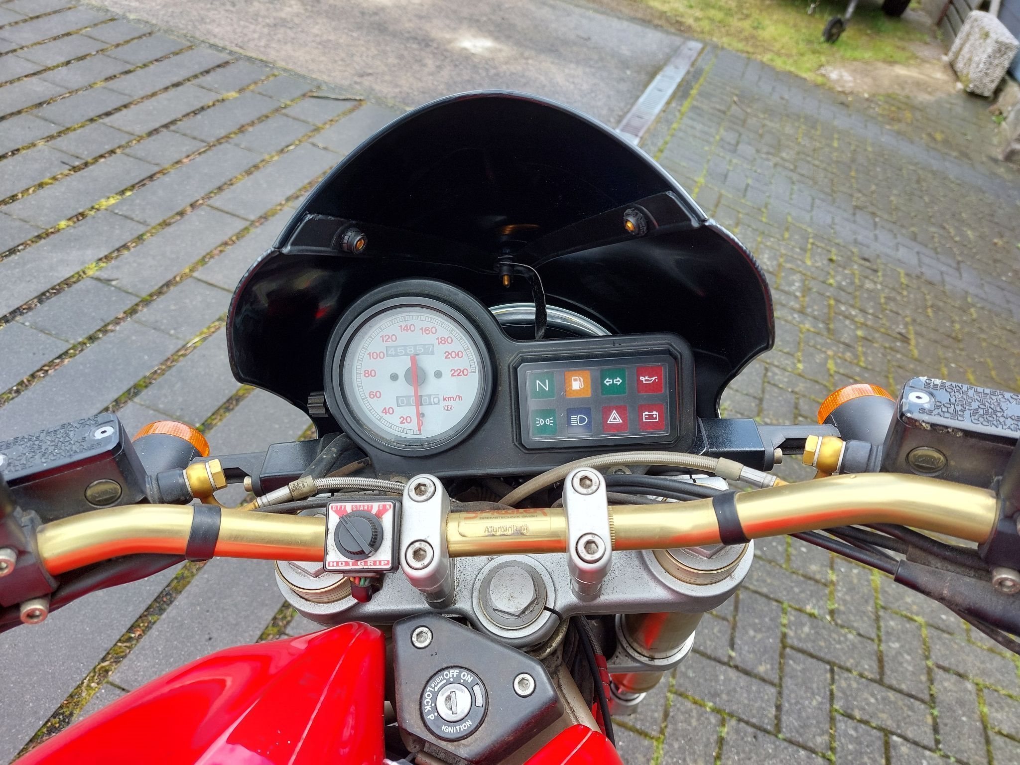 Und für die Sitzposition ist ein Superbike-Lenker verbaut worden! Stahlflex, Gel-Batterie, Scottoiler und Heizgriffe hat die Duc auch! Neu ist der Rundscheinwerfer in LED! Steinschlag hat das Originalglas unbrauchbar gemacht! Ein Winschild von PUIG gab es auch noch!