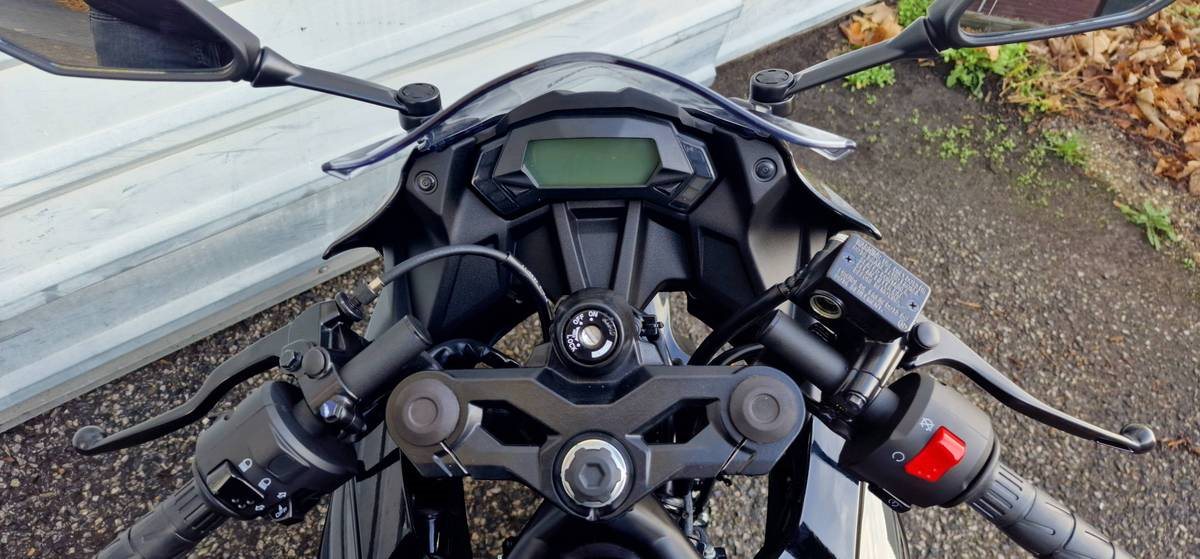 Die Ergonomie der Ninja 125 wurde für sportliches Fahren auf der Straße entwickelt. Die Sitzposition ist natürlich aggressiv, wobei sich der Fahrer nach vorne lehnt, um den schnittigen Stummellenker zu erreichen.