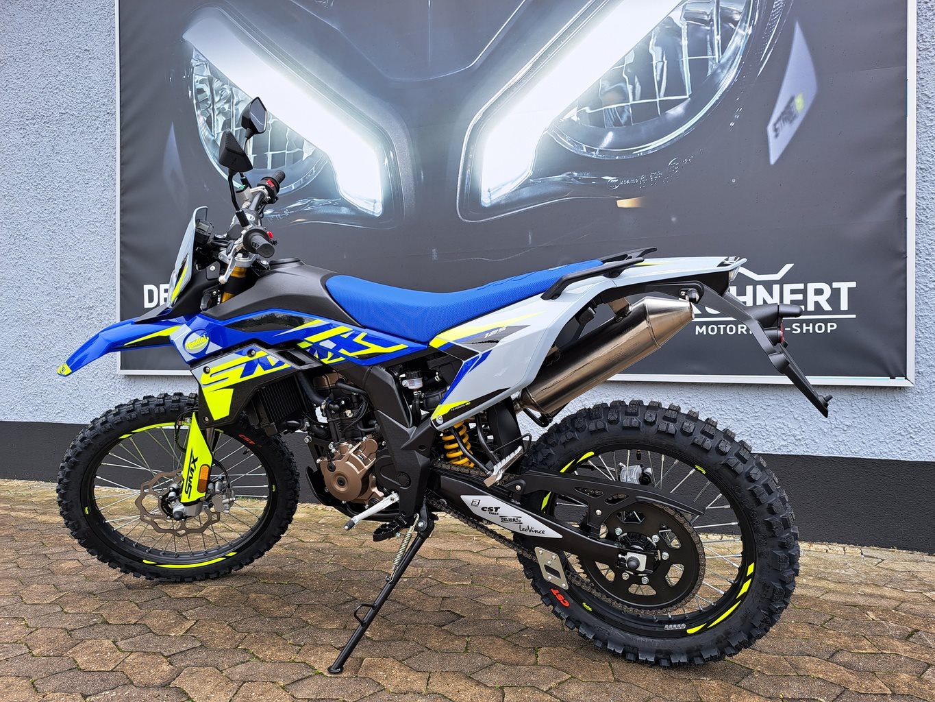 Wer Lust auf eine ausgiebige Tour mit einem Offroad Motorrad hat, ist bei der F.B Mondial SMX 125i ABS Enduro genau richtig. Diese Maschine kombiniert optimale Federungstechnik mit einer ausgeklügelten, leistungsstarken Motor-Charakteristik. Die F.B Mondial SMX 125i Enduro ABS ist daher optimal ausgestattet für Touren auf Trails abseits der Straße. Aber auch auf Asphalt macht sie optisch eine sportliche Figur. Dabei bleibt das Bike dem Grundsatz aus früheren F.B Mondial Zeiten treu und verbindet klassisches italienisches Design mit höchster Zuverlässigkeit und Qualität.