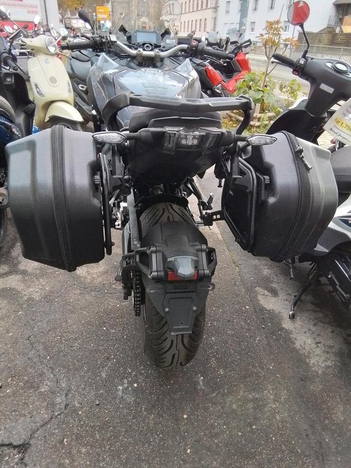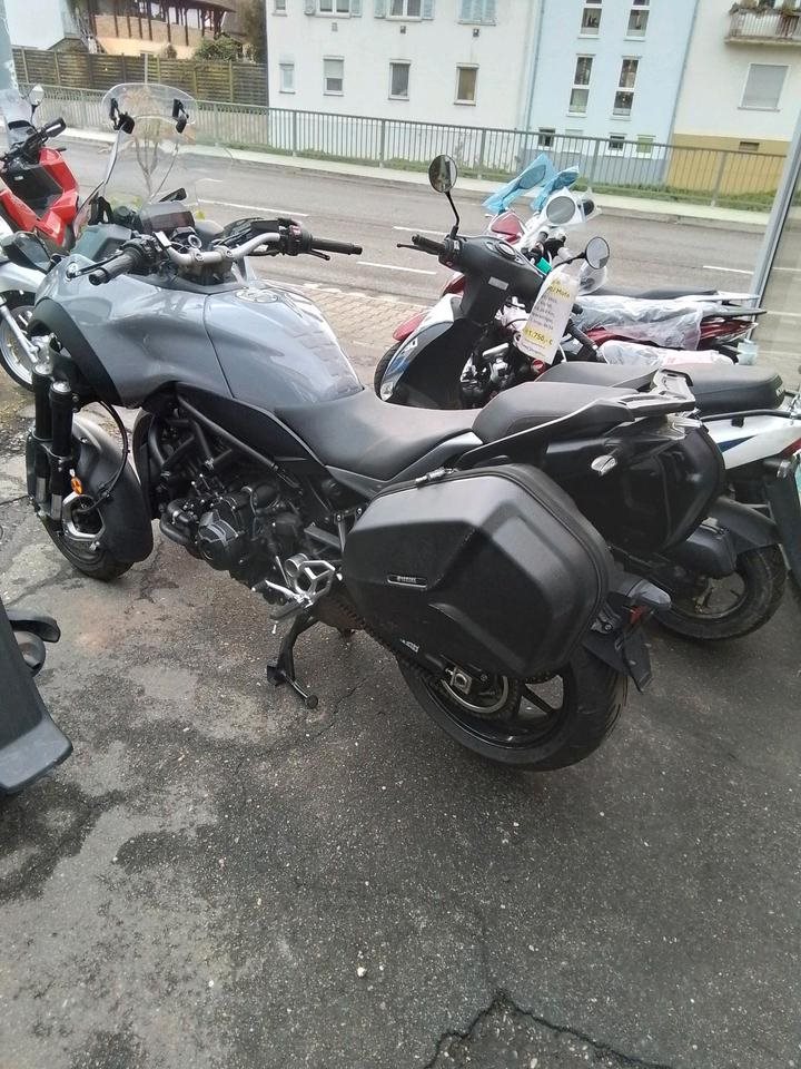 Die Niken ist Tiefergelegt hat neue Federn, andere Reifen, CLS Öler, Quickshiffter, Griffheizung, Koffer und einen 10 Liter Tankrucksack