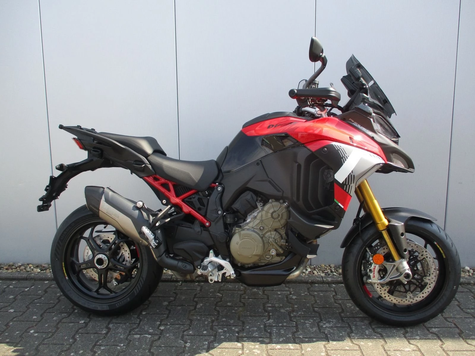 - Serienausstattung: elektronisch einstellbare Öhlins Smart EC 2.0 Federung, Ducati Quick Shift, Abstandstempomat, Hands-Free, beleuchtete Bedienelemente, Voll-LED-Scheinwerfer, vorderer Kotflügel und Schnabela us Carbon, Akrapovic Endschalldämpfer