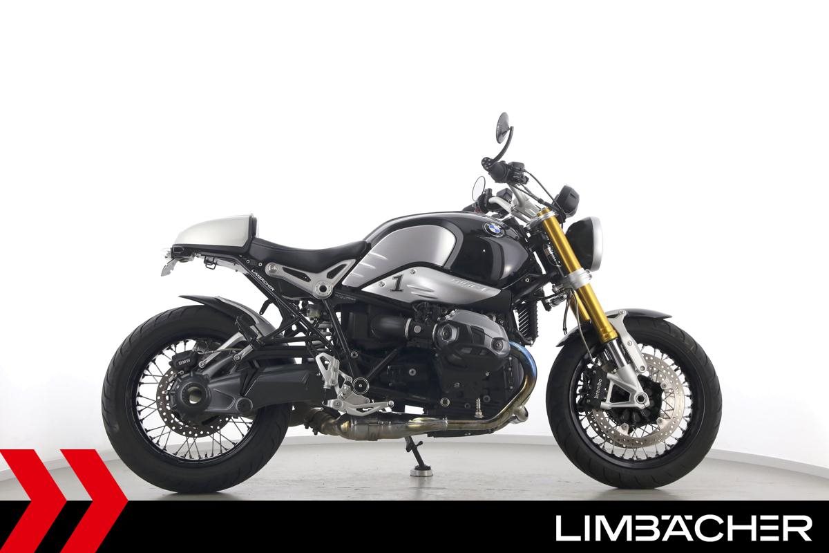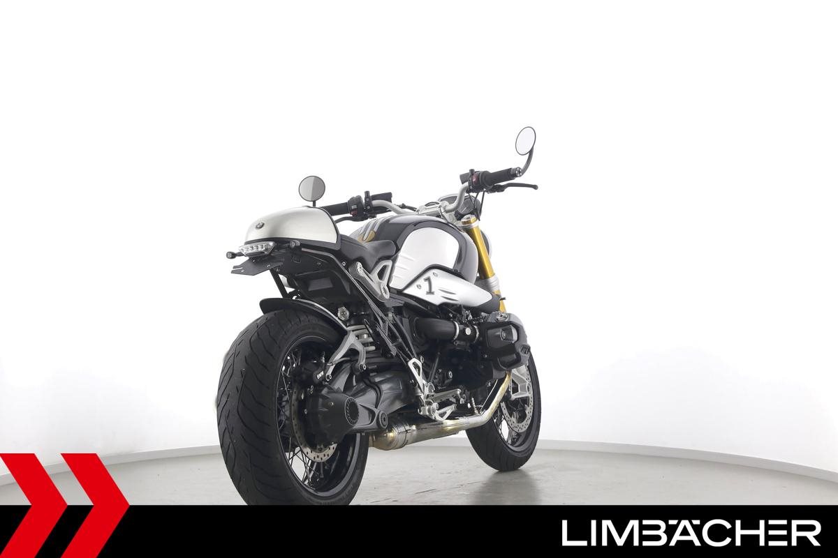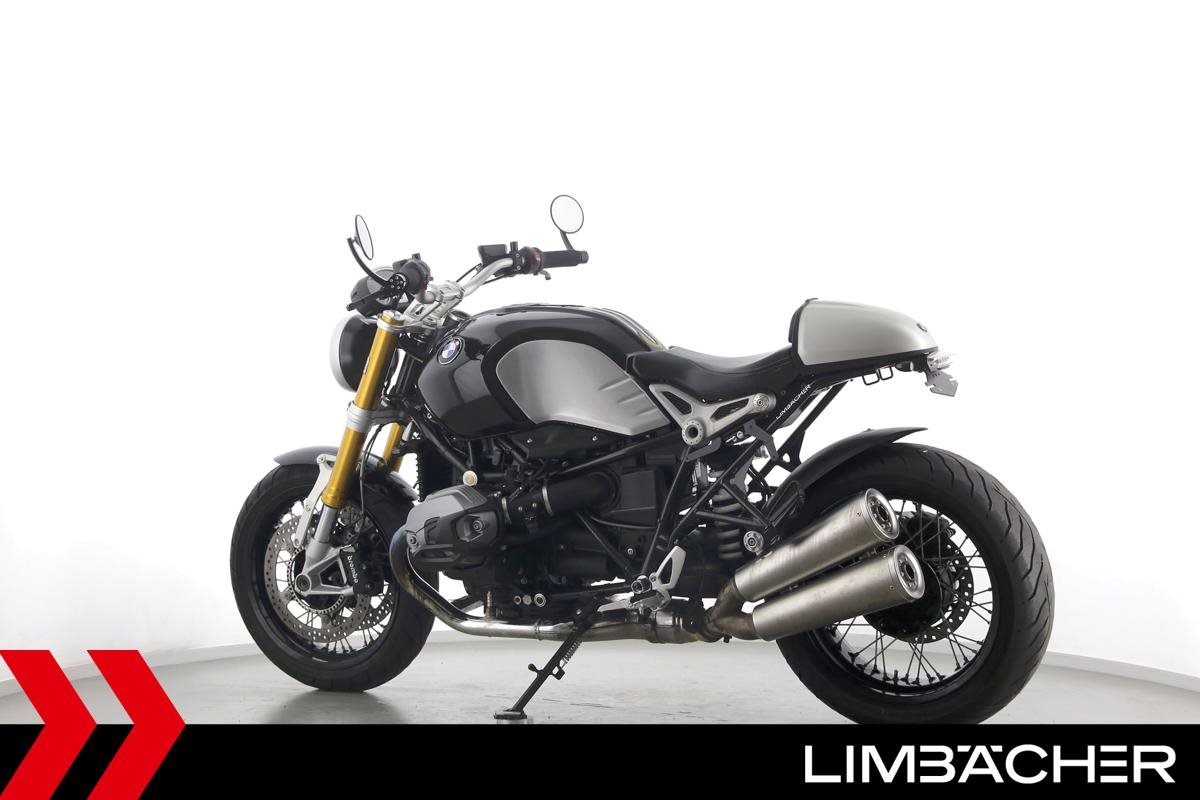 Eine BMW R nineT in gepflegtem Zustand u.a. mit Akrapovic-Doppel-Endschalldämpfer sowie kurzem Kennzeichenhalter.