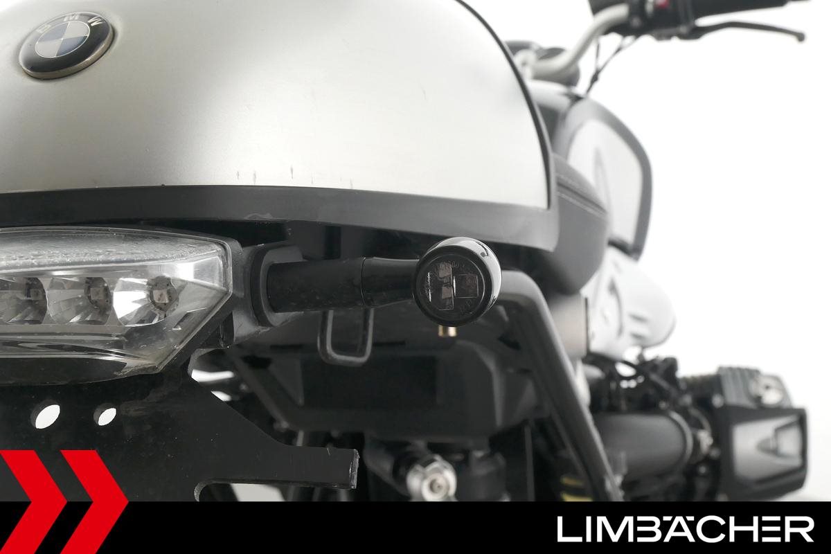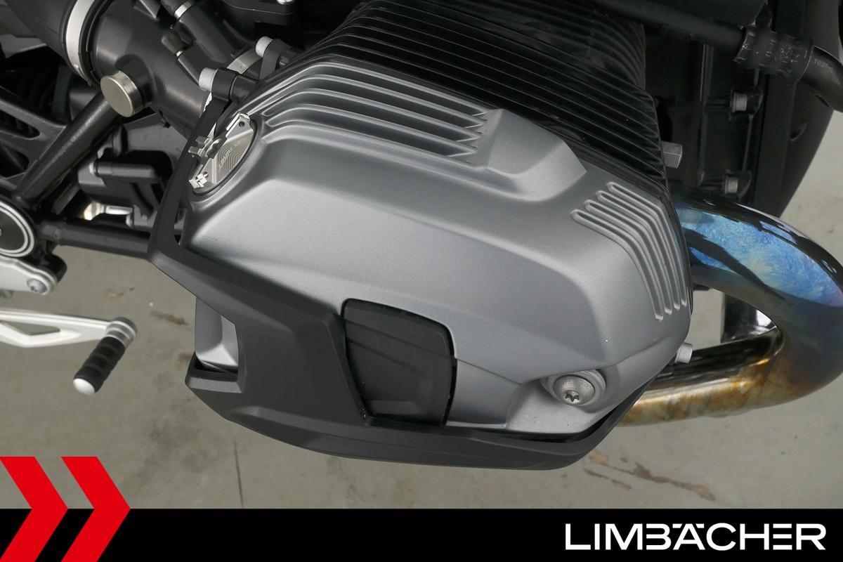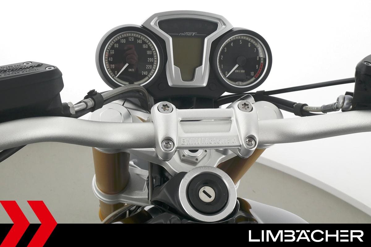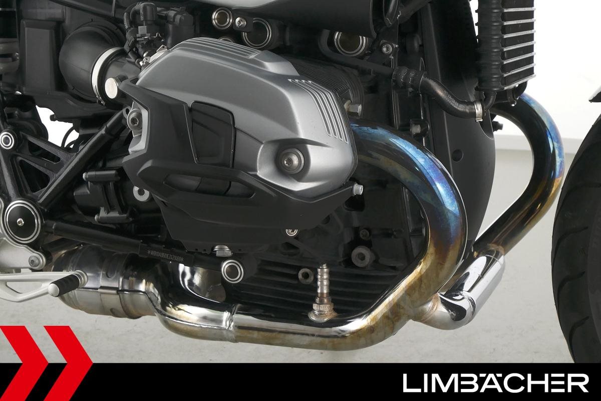 Eine BMW R nineT in gepflegtem Zustand u.a. mit Akrapovic-Doppel-Endschalldämpfer sowie kurzem Kennzeichenhalter.