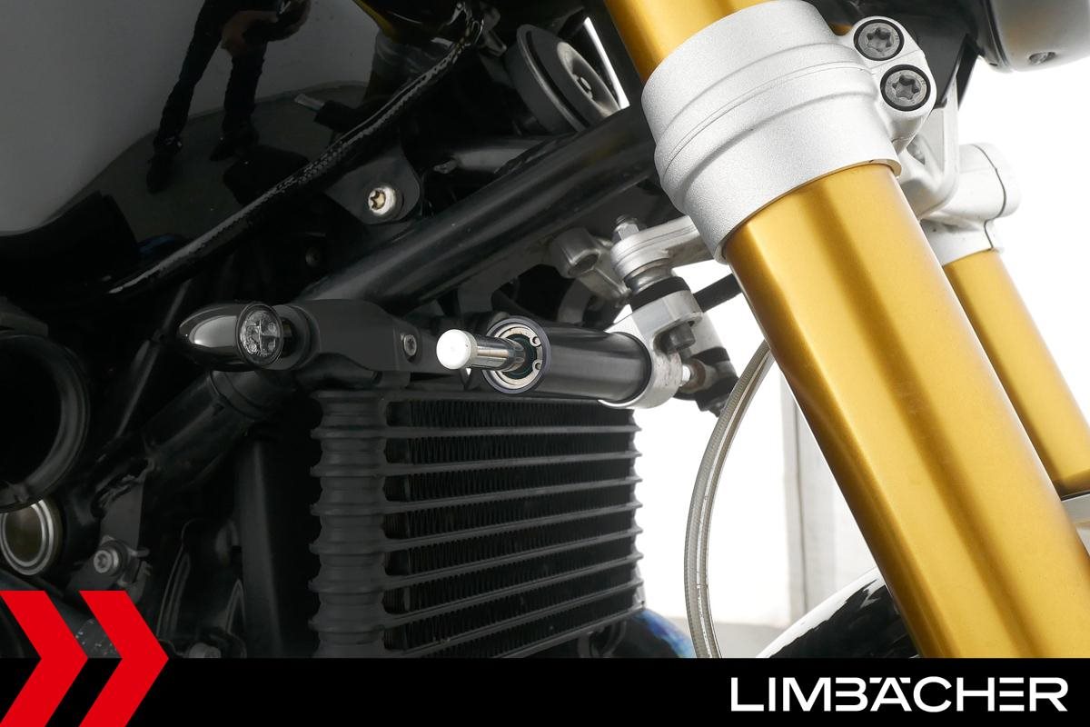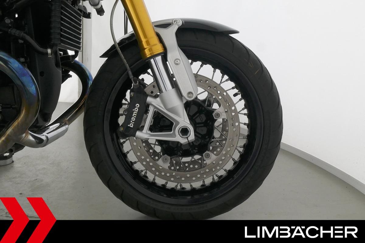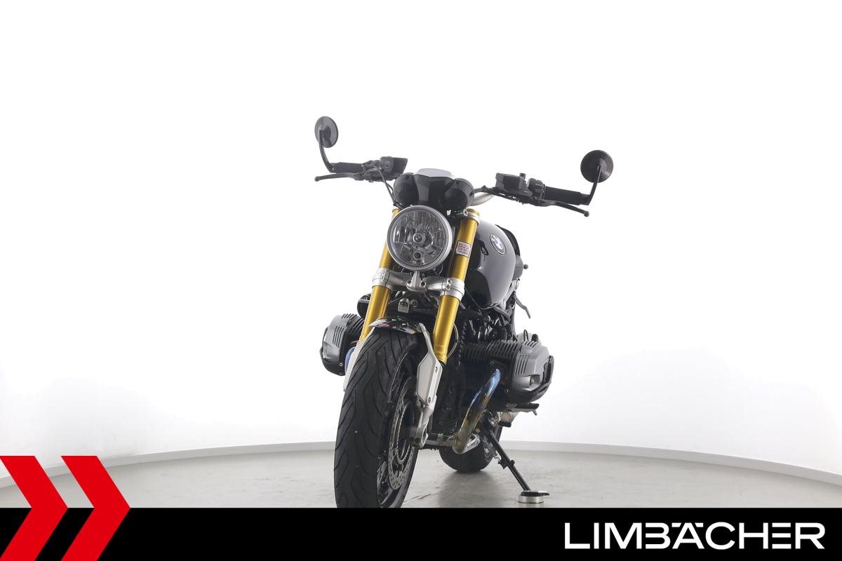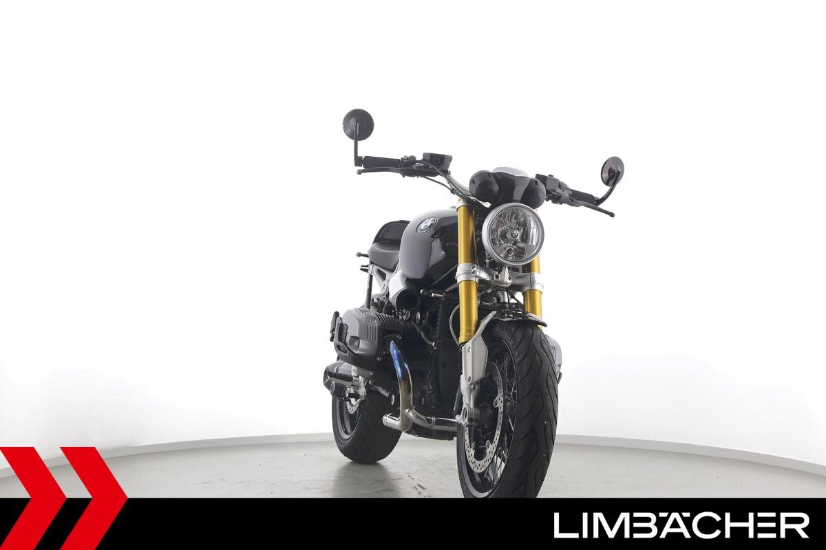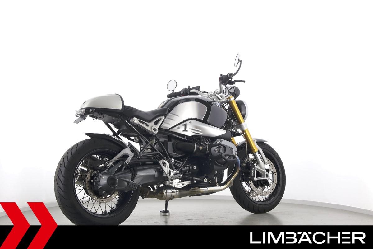 Eine BMW R nineT in gepflegtem Zustand u.a. mit Akrapovic-Doppel-Endschalldämpfer sowie kurzem Kennzeichenhalter.
