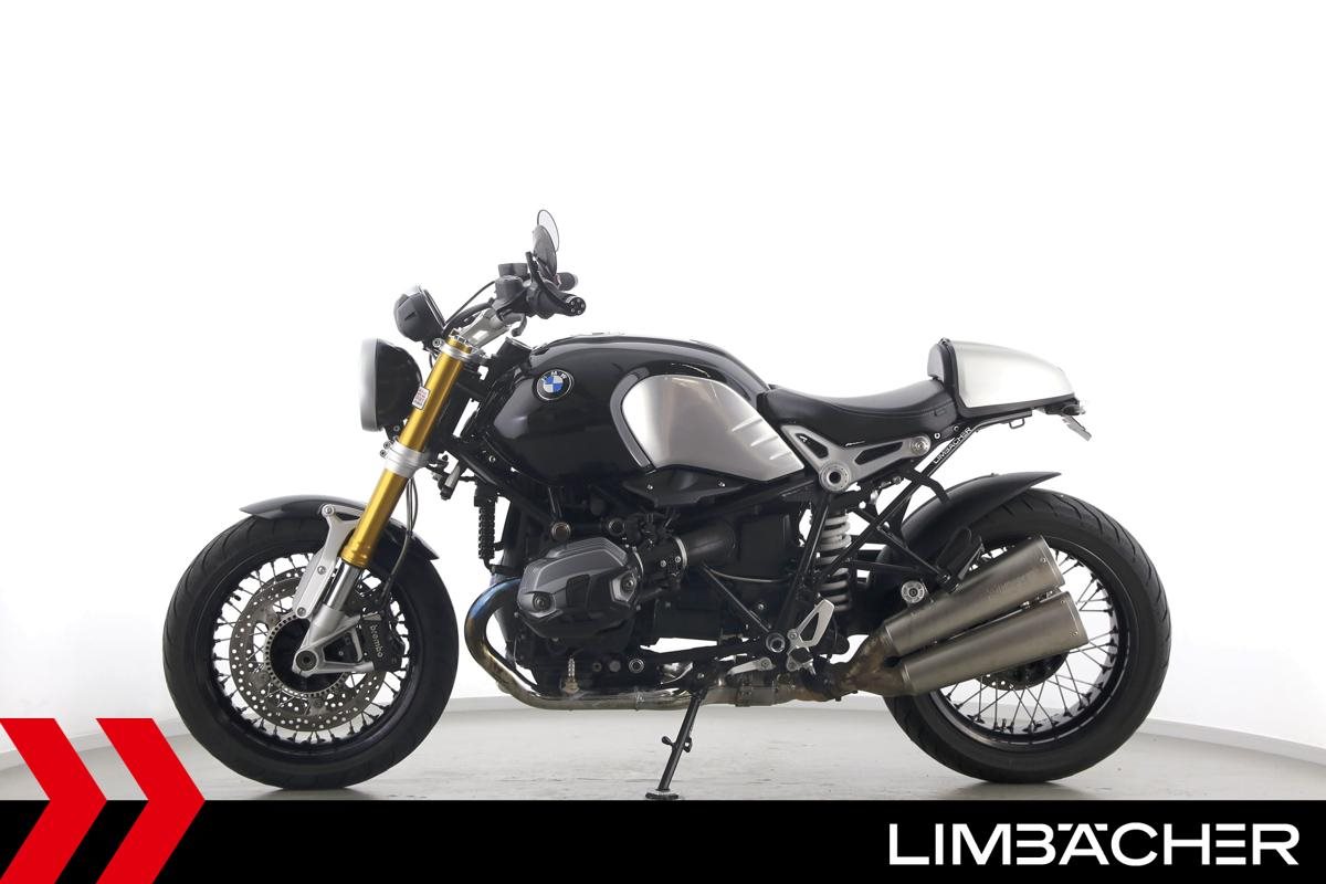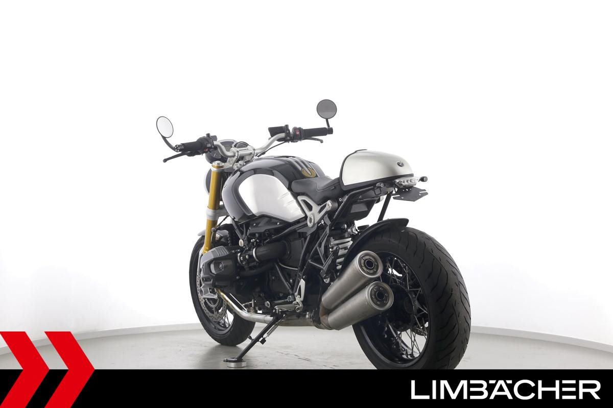 Eine BMW R nineT in gepflegtem Zustand u.a. mit Akrapovic-Doppel-Endschalldämpfer sowie kurzem Kennzeichenhalter.