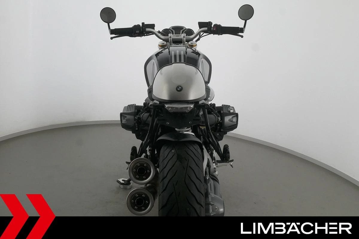 Eine BMW R nineT in gepflegtem Zustand u.a. mit Akrapovic-Doppel-Endschalldämpfer sowie kurzem Kennzeichenhalter.