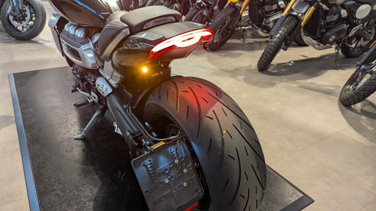 Sondermodell TRIUMPH Rocket "die WALZE"! So muss der Hinterreifen der Rocket zu sehen sein. Wunderschöner Heckumbau eines ohnehin schon tollen Bikes. Mit dem an die Seite verlegten Kennzeichenträger kommt der 240er Hinterreifen erst richtig zur Geltung. Die Power LEDs sind fein unter dem Heck plaziert, der CNC gefräßte Kennzeichenhalter mit Power LED Kennzeichenbeleuchtung runden das Bild StVZO-konform ab. Auch vorne zeigen leichtstarke, aber kleine Power-LEDs den Richtungswechsel an. Aber vorne braucht man bei der Rocket eigentlich keine Blinker. Die anderen sehen Dich mit der Rocket sowieso nur von hinten!!!