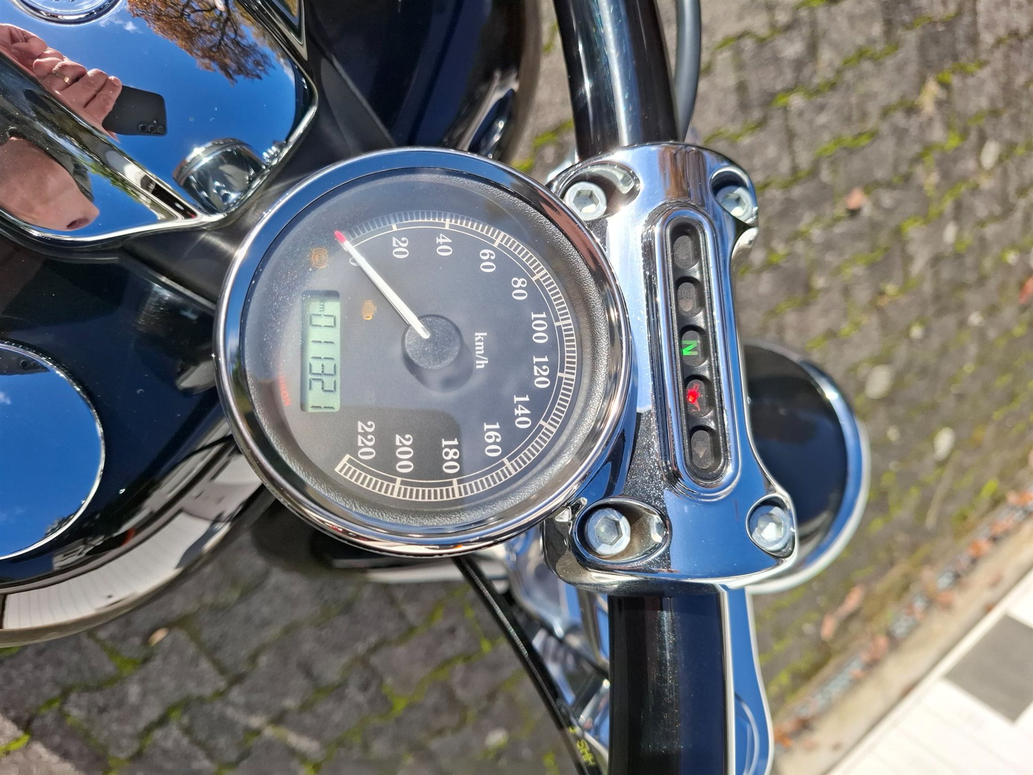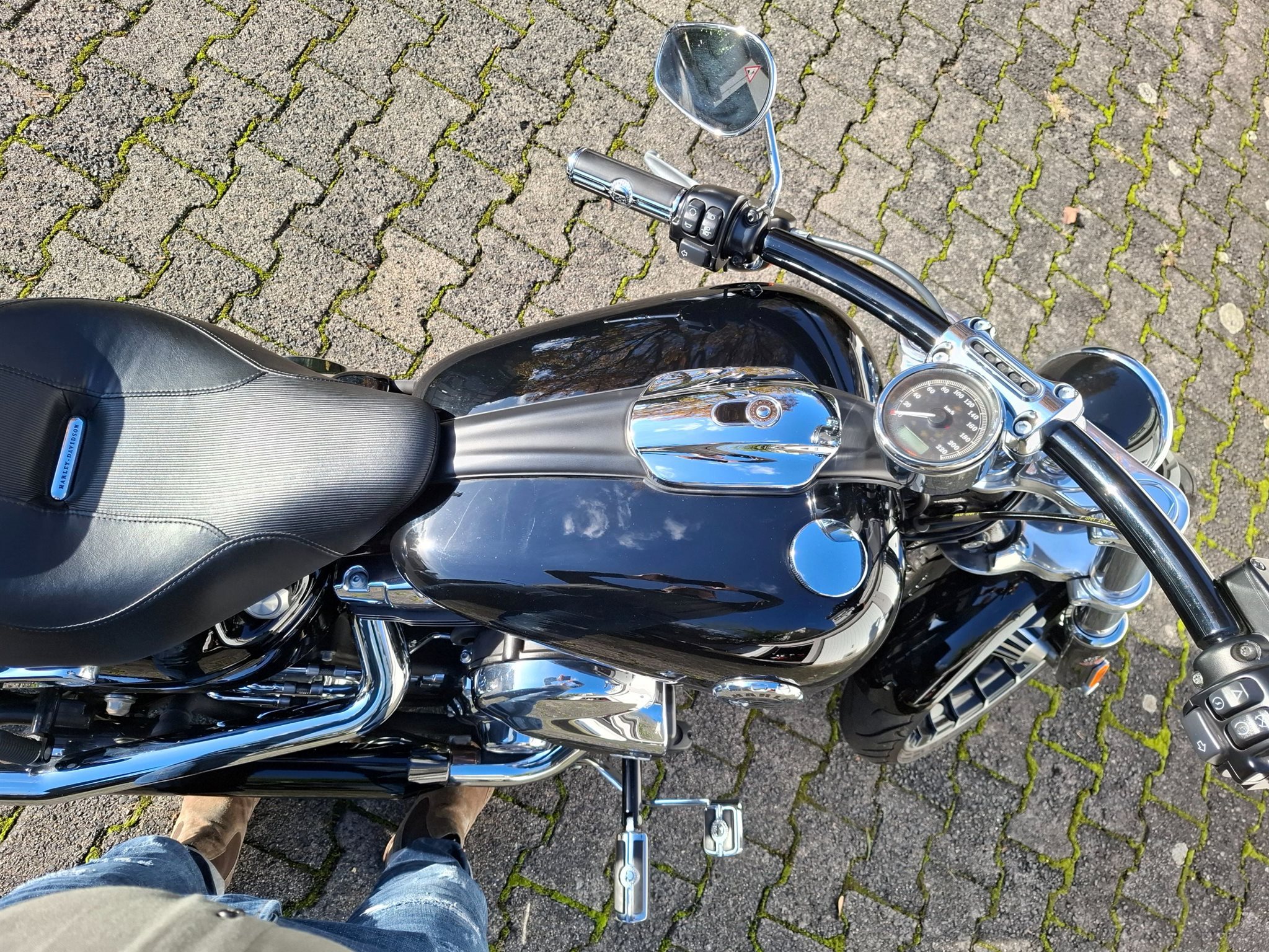 Die Handgriffe und Fußrasten vorne habe ich bei HD austauschen lassen (jetzt mit Totenkopf), Kennzeichenhalterung hat HD auf die Seite verlegt. Der Rest ist alles original ab Werk.
