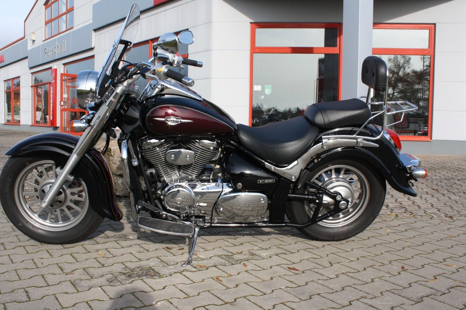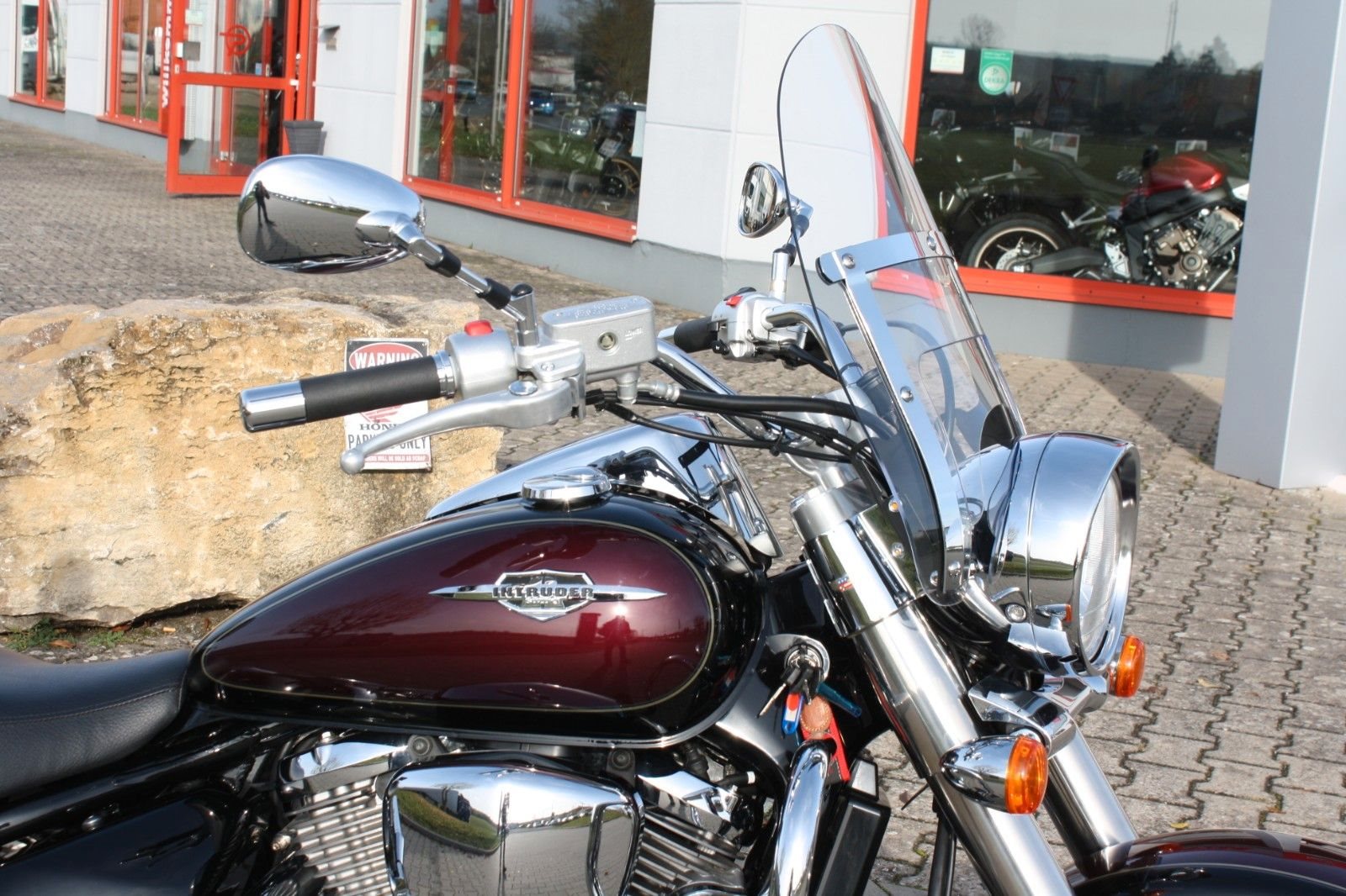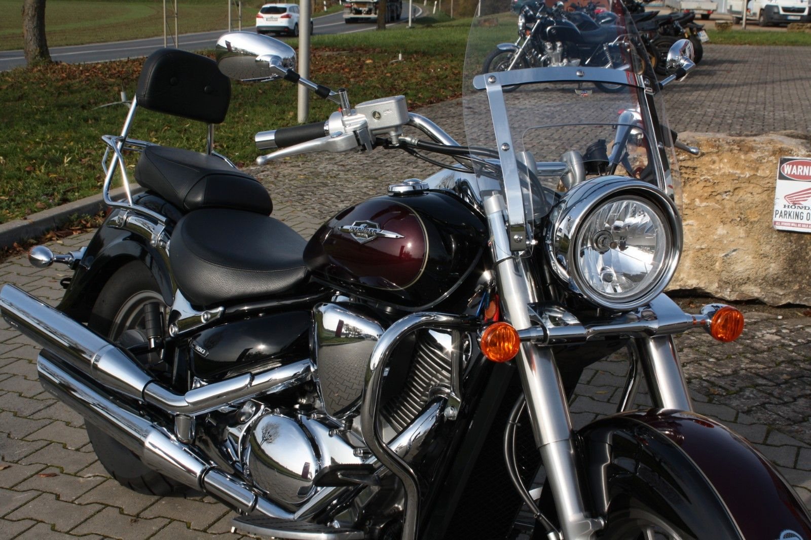 Zum Verkauf steht eine Suzuki Intruder C 800 in Schwarz und Weinrot-Metallic. Das Motorrad befindet sich in hervorragend gepflegtem Zustand. Ausgestattet ist die Intruder unter anderem mit einem massiven Sturzbügel, einer großen Windschutzscheibe sowie einer Sissy Bar mit Gepäckträger, die zusätzlichen Komfort für den Sozius bietet. Der Jahreskundendienst wurde frisch durchgeführt, und alle Verschleißteile befinden sich in gutem Zustand. Ein sehr schöner Cruiser - ideal für entspannte Touren.