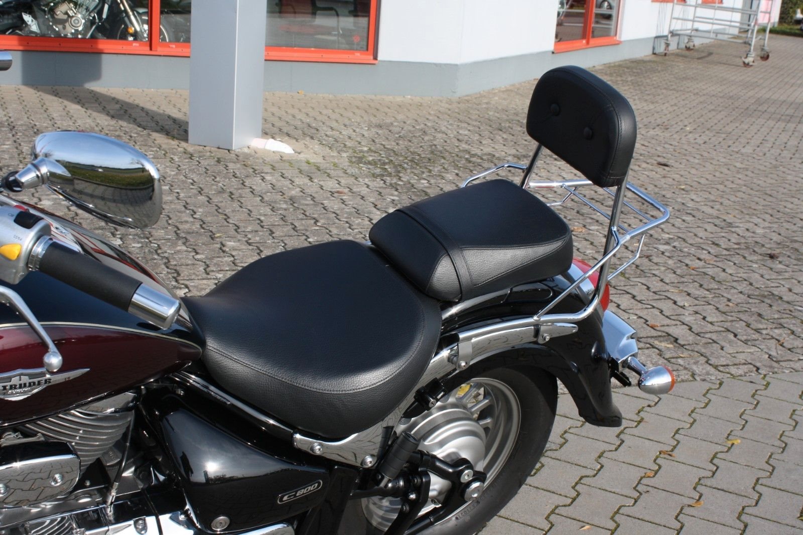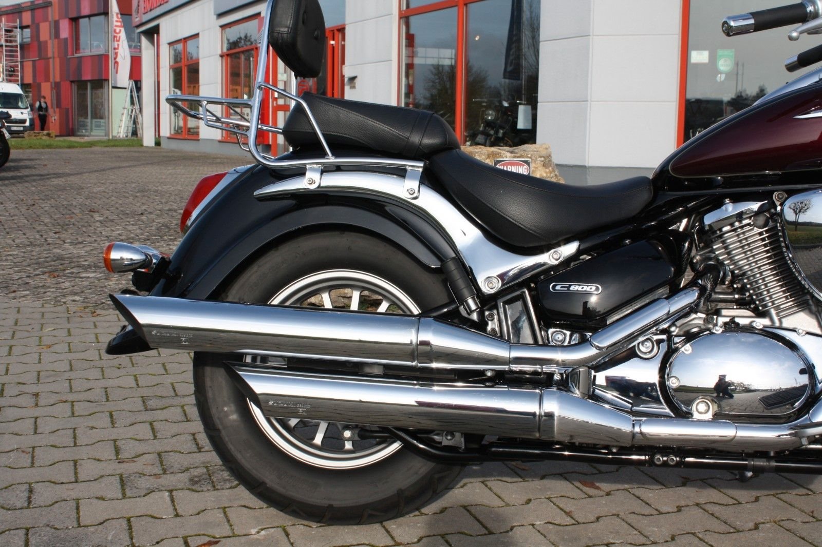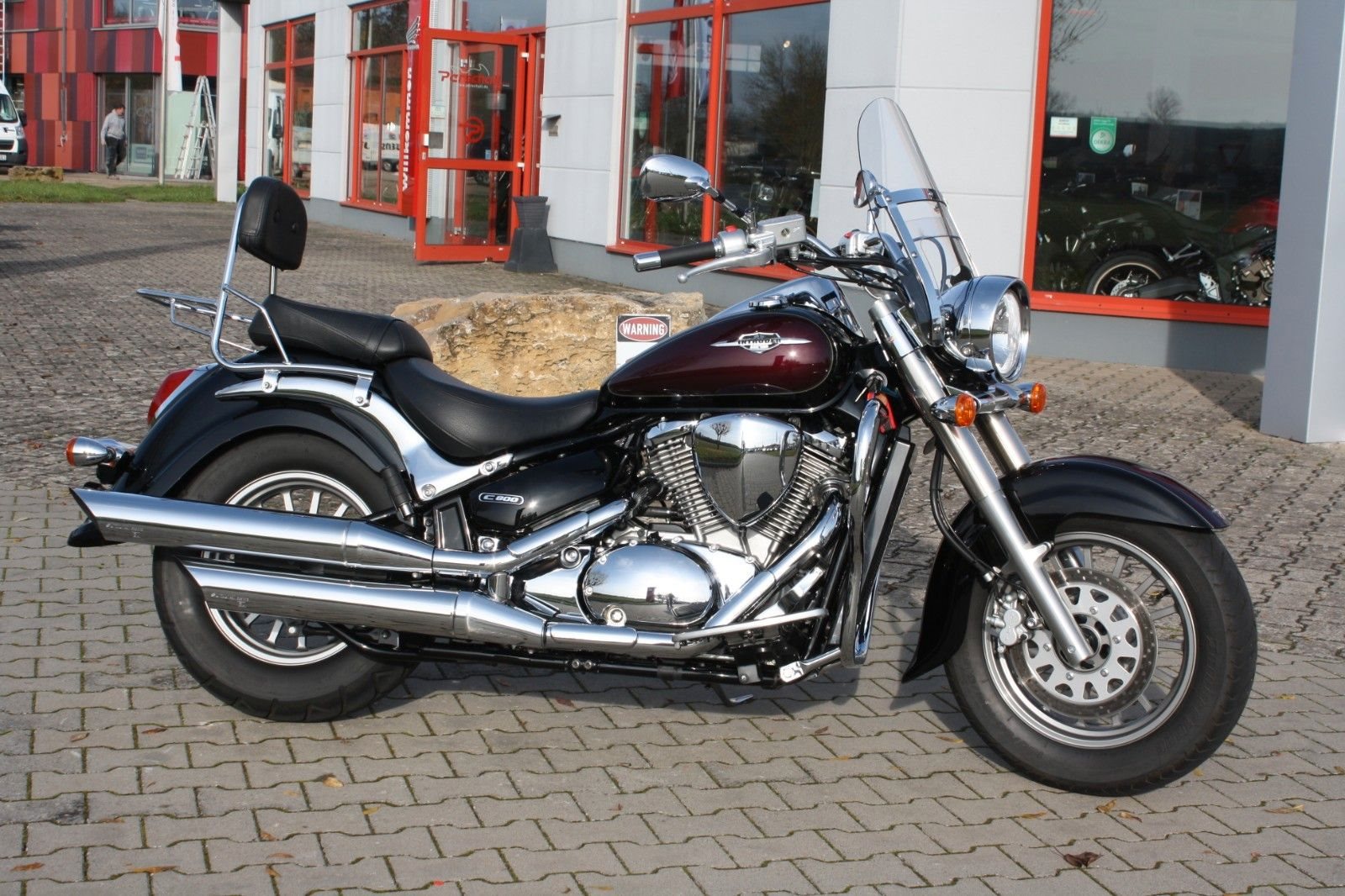 Zum Verkauf steht eine Suzuki Intruder C 800 in Schwarz und Weinrot-Metallic. Das Motorrad befindet sich in hervorragend gepflegtem Zustand. Ausgestattet ist die Intruder unter anderem mit einem massiven Sturzbügel, einer großen Windschutzscheibe sowie einer Sissy Bar mit Gepäckträger, die zusätzlichen Komfort für den Sozius bietet. Der Jahreskundendienst wurde frisch durchgeführt, und alle Verschleißteile befinden sich in gutem Zustand. Ein sehr schöner Cruiser - ideal für entspannte Touren.