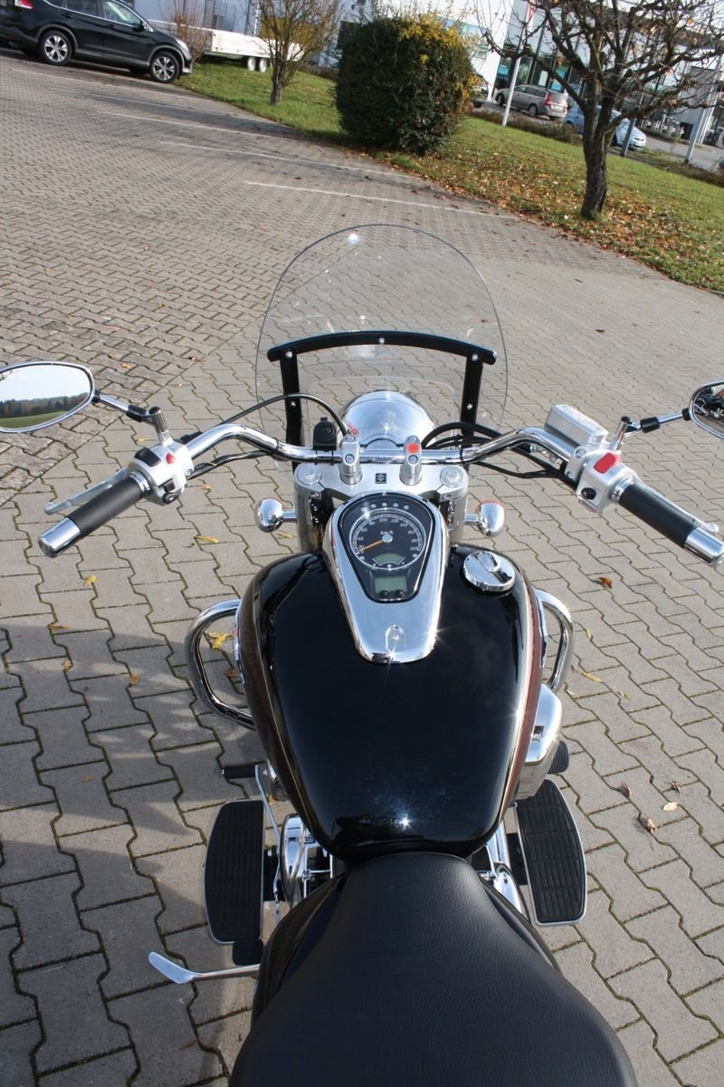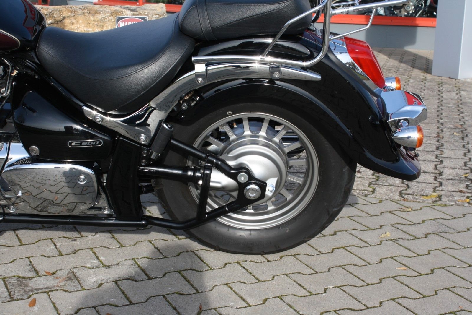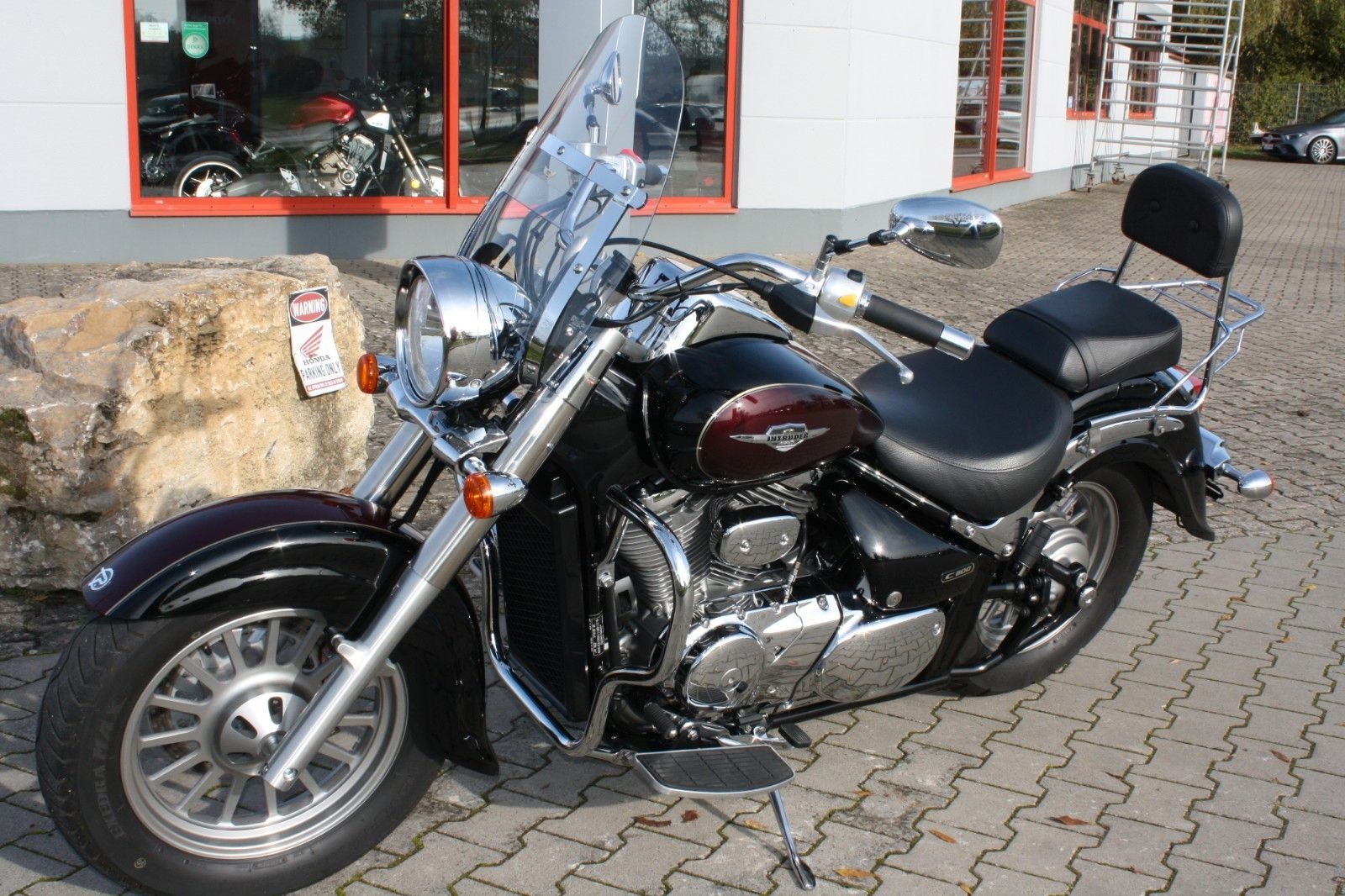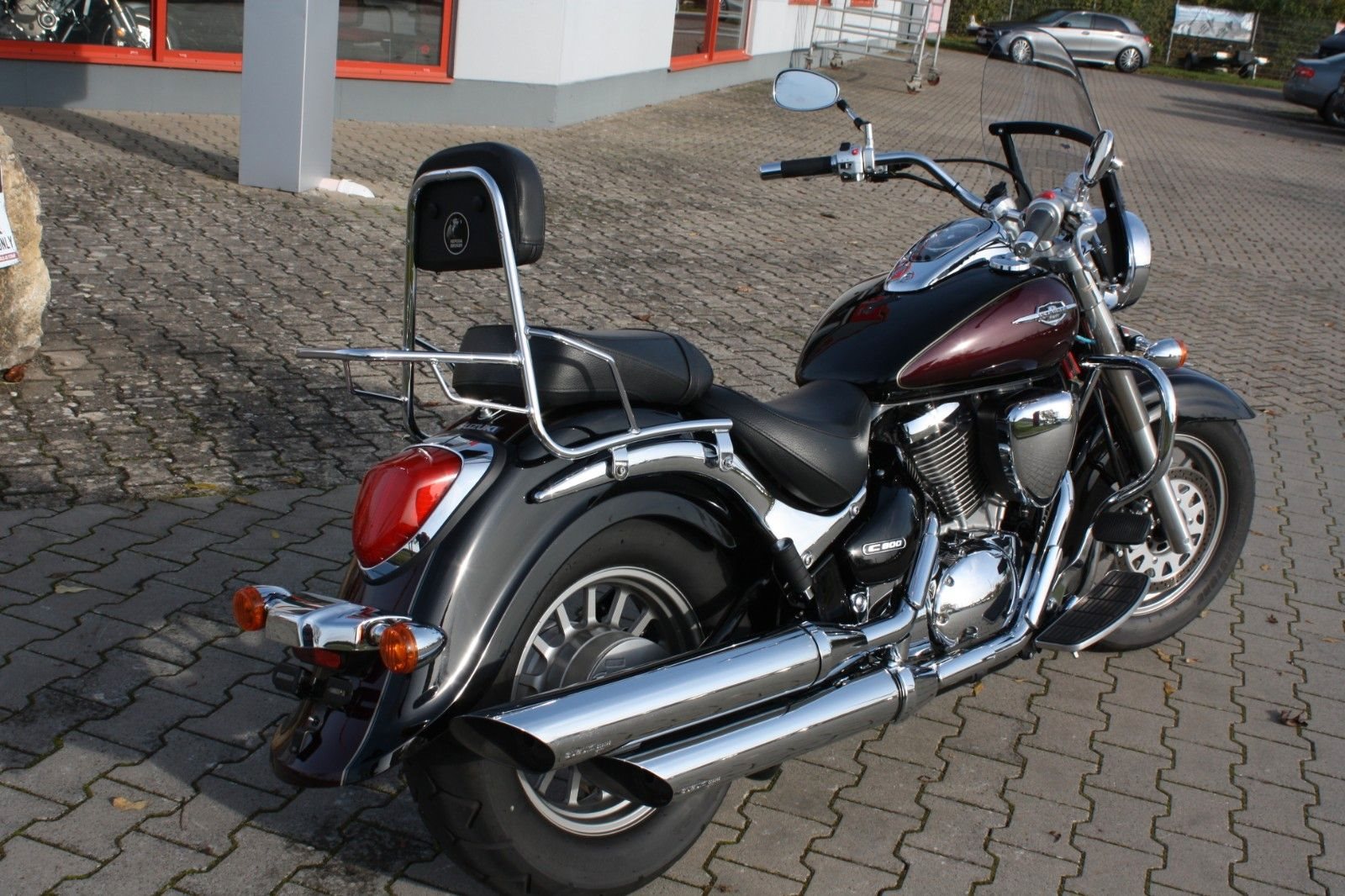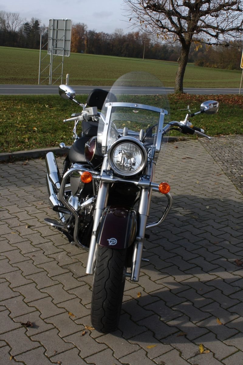 Zum Verkauf steht eine Suzuki Intruder C 800 in Schwarz und Weinrot-Metallic. Das Motorrad befindet sich in hervorragend gepflegtem Zustand. Ausgestattet ist die Intruder unter anderem mit einem massiven Sturzbügel, einer großen Windschutzscheibe sowie einer Sissy Bar mit Gepäckträger, die zusätzlichen Komfort für den Sozius bietet. Der Jahreskundendienst wurde frisch durchgeführt, und alle Verschleißteile befinden sich in gutem Zustand. Ein sehr schöner Cruiser - ideal für entspannte Touren.