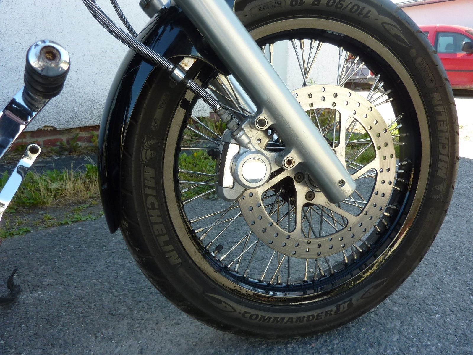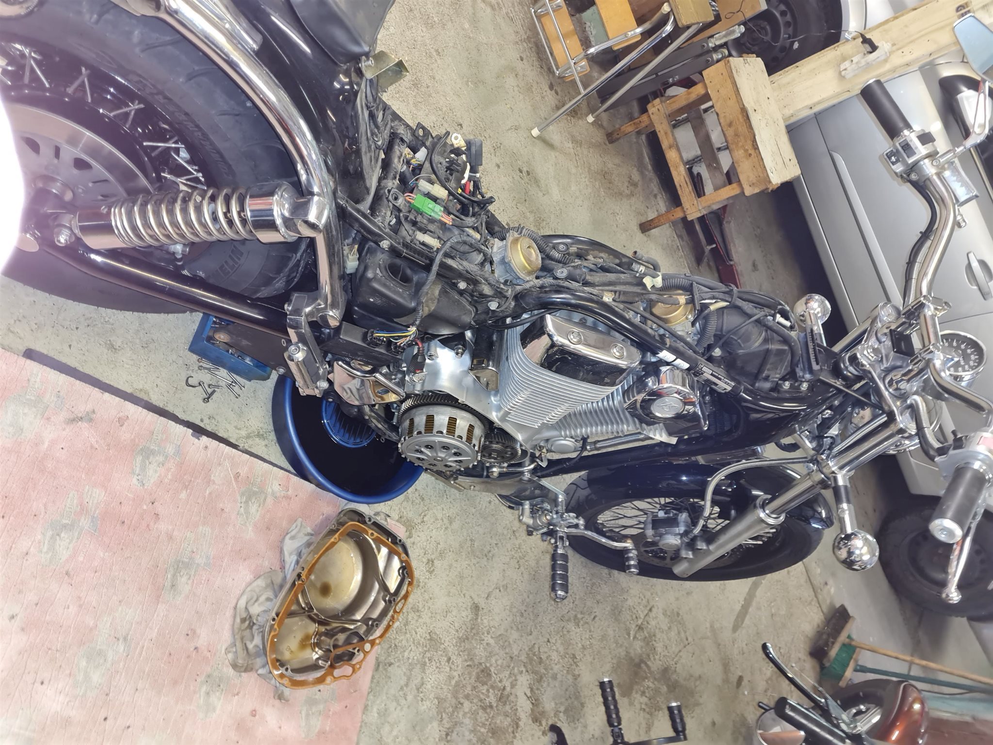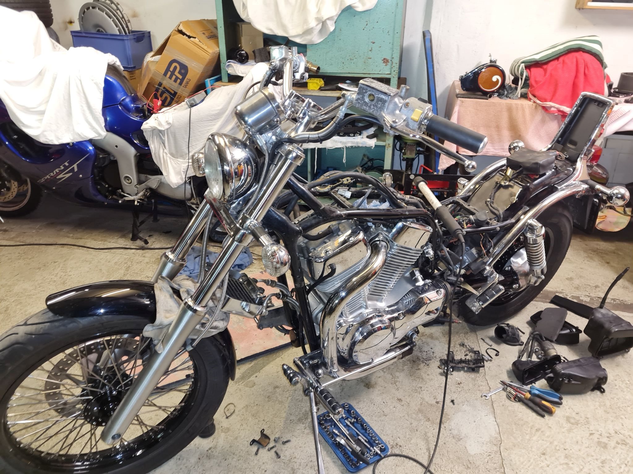 Tank gesäubert, verstärkte Kupplung eingebaut, Kupplungsdeckel hatte Rost unterm Chrom und wurde erneuert. Vergaser synchronisiert, Sitzbank neu bezogen, die Felgen wurden lackiert und mit Edelstahlspeichen bestückt!