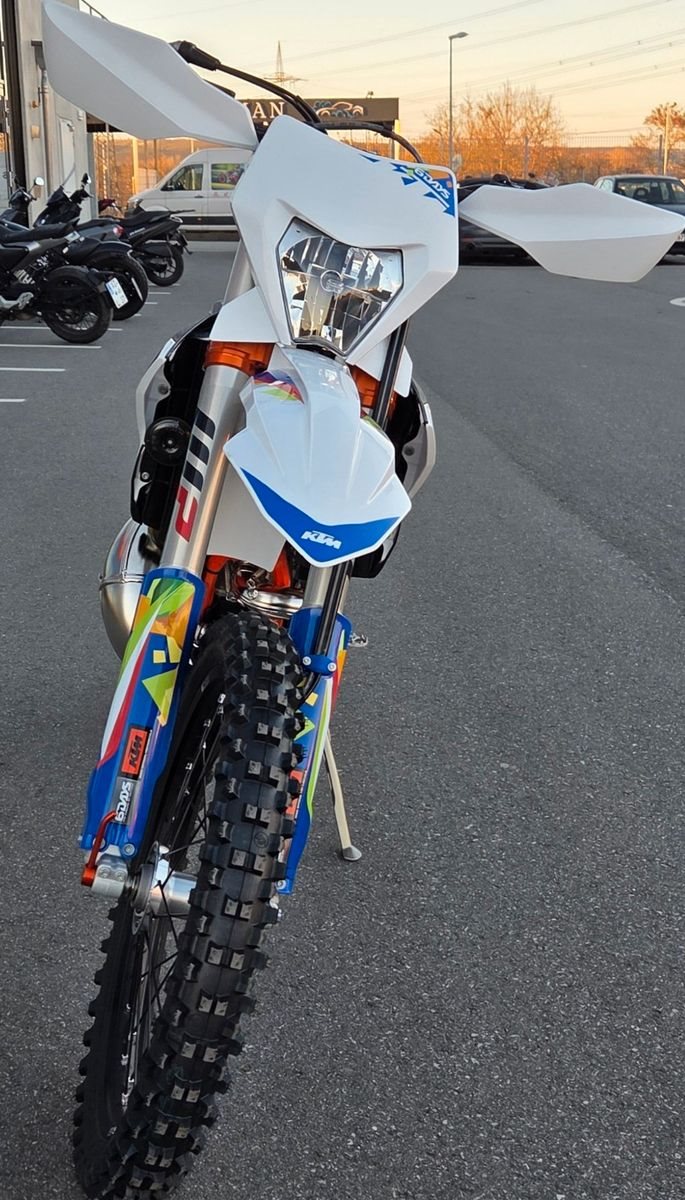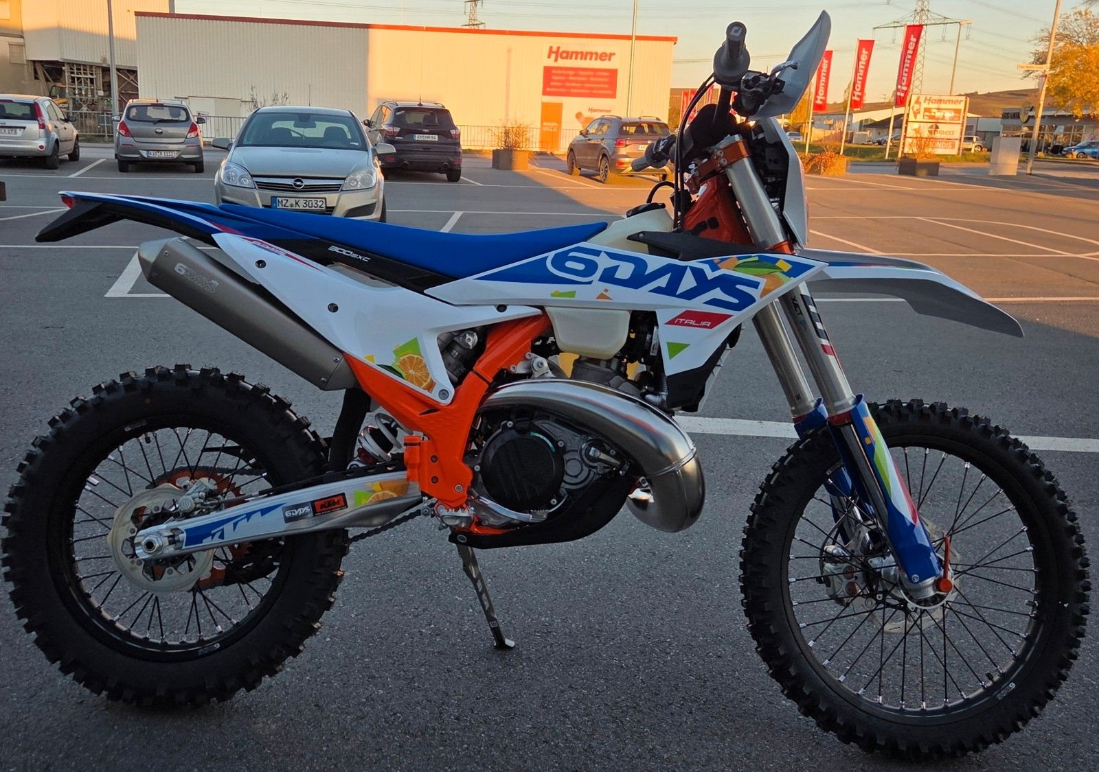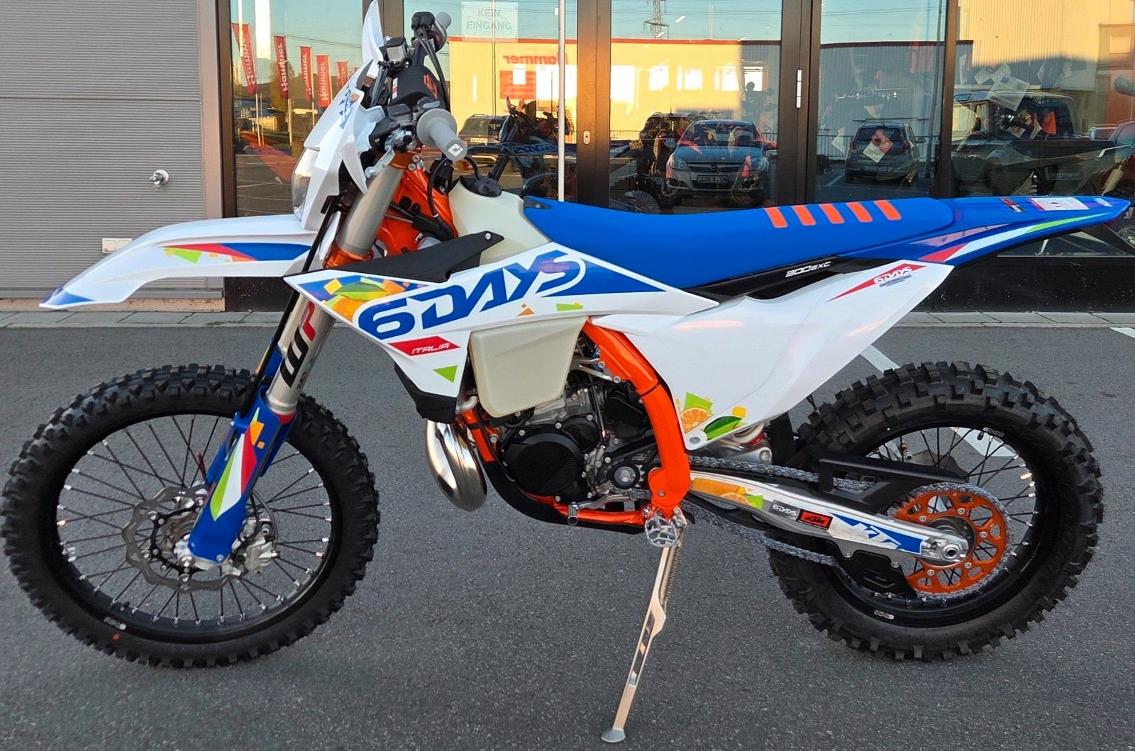 Der KTM 300 EXC 6DAYS fehlen vielleicht ein paar Buchstaben im Titel, aber sei versichert, sie ist immer noch die 100% READY TO RACE Enduro-Waffe, die sie schon immer war. Mit seinem bewährten, kugelsicheren Antriebsstrang, seiner unübertroffenen Geschwindigkeit oben und seiner traktorähnlichen Kraft im unteren Drehzahlbereich - ganz zu schweigen von seinem überragenden Fahrverhalten - ist er wieder einmal bereit, seinen Trophäenschrank um weitere glänzende Silberlinge zu erweitern. Zu den spezifischen Teilen für die KTM 300 EXC 6DAYS gehören:* ORANGEFARBENE ELOXIERTE CNC-GEFRÄSTE GABELBRÜCKEN