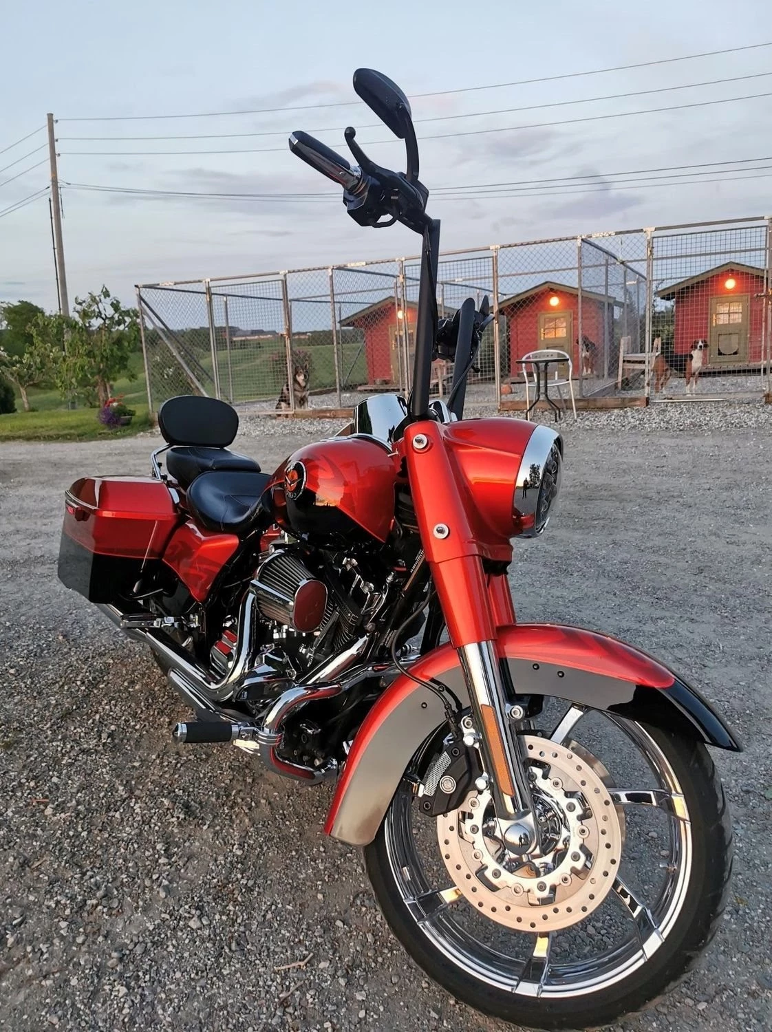Zum Verkauf steht eine außergewöhnlich schöne Harley-Davidson Road King mit 14-Zoll-Chubby-Lenker, der dem Bike eine kraftvolle Optik und eine sehr angenehme Sitzposition verleiht.