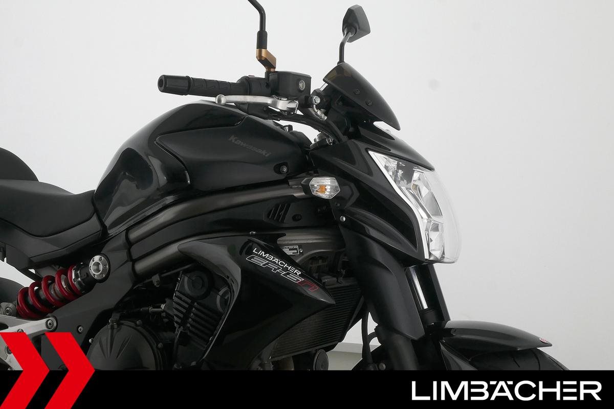 Eine Kawasaki ER-6n in gepflegtem Zustand u.a. mit Sturzbügel und Custom-Ganganzeige.