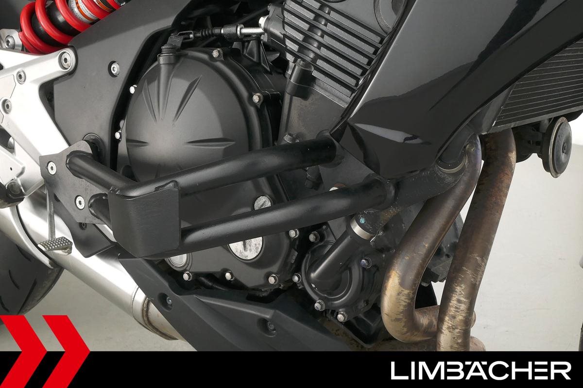 Eine Kawasaki ER-6n in gepflegtem Zustand u.a. mit Sturzbügel und Custom-Ganganzeige.