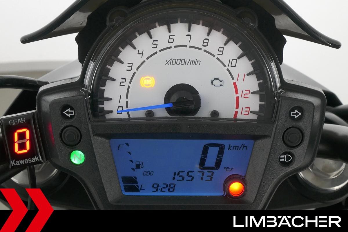 Eine Kawasaki ER-6n in gepflegtem Zustand u.a. mit Sturzbügel und Custom-Ganganzeige.