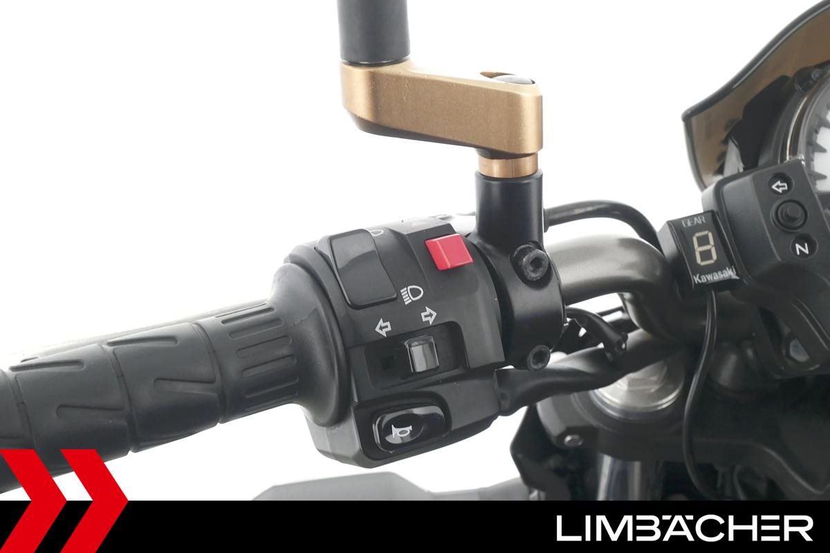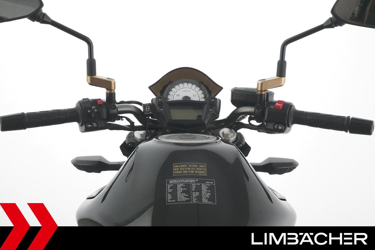 Eine Kawasaki ER-6n in gepflegtem Zustand u.a. mit Sturzbügel und Custom-Ganganzeige.