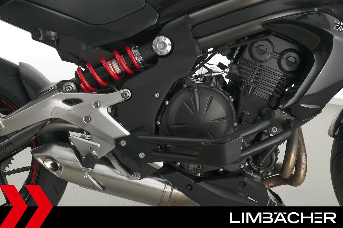 Eine Kawasaki ER-6n in gepflegtem Zustand u.a. mit Sturzbügel und Custom-Ganganzeige.