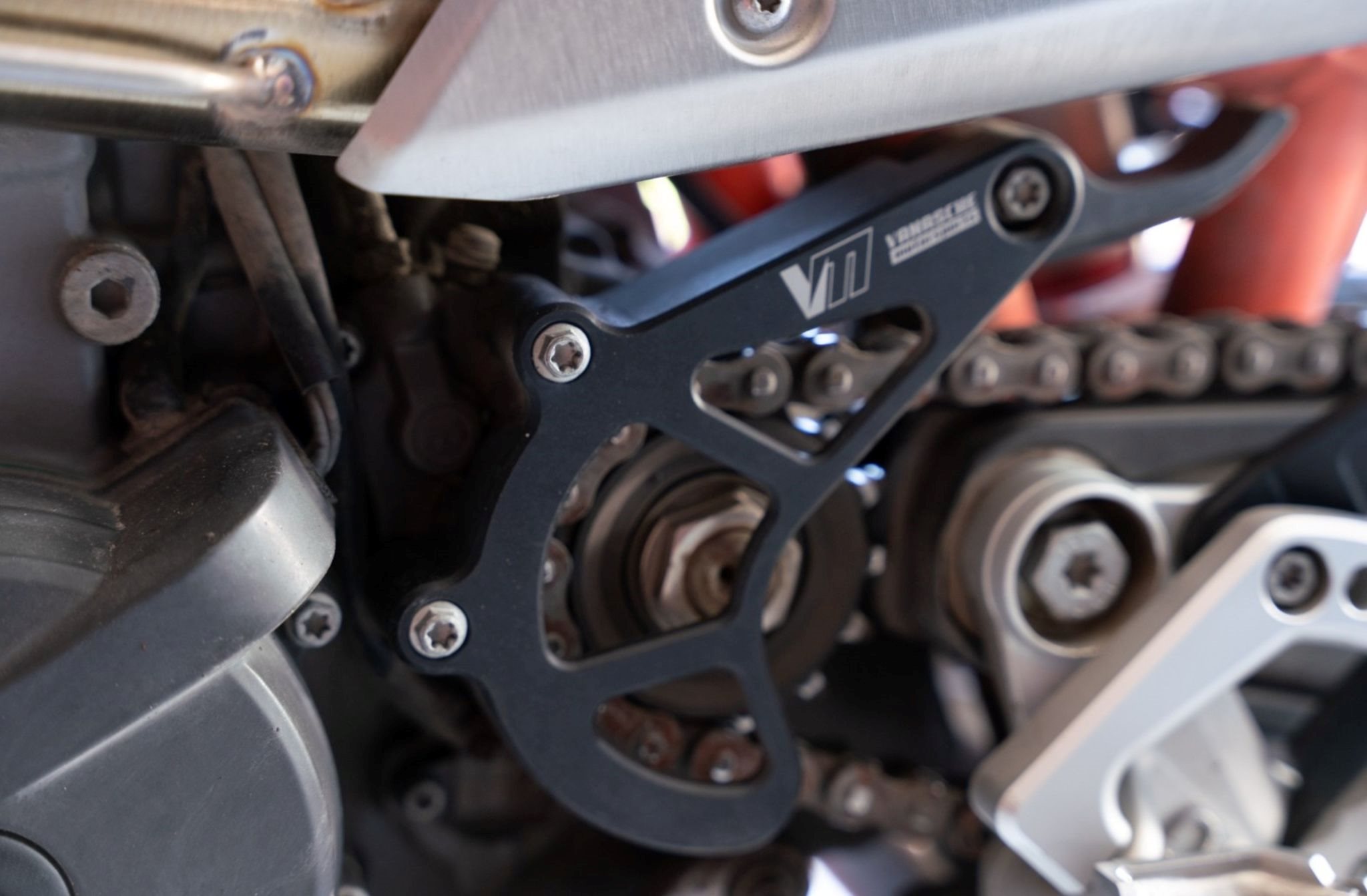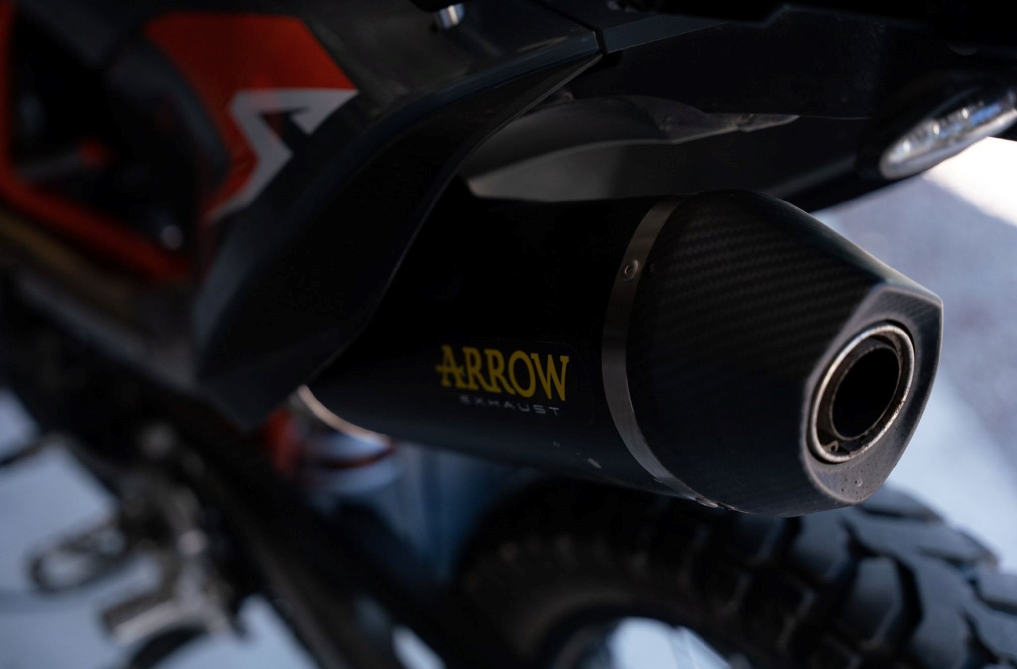 Zusätzlich ist ein robuster Alu-Unterfahrschutz montiert und ein kurzer KTM Kennzeichenhalter. Für satten Sound sorgt ein Arrow Slip-on Auspuff mit CE-Zulassung. Kupplungs- und Bremshebel sowie der Tankdeckel sind aus eloxiertem Aluminium.