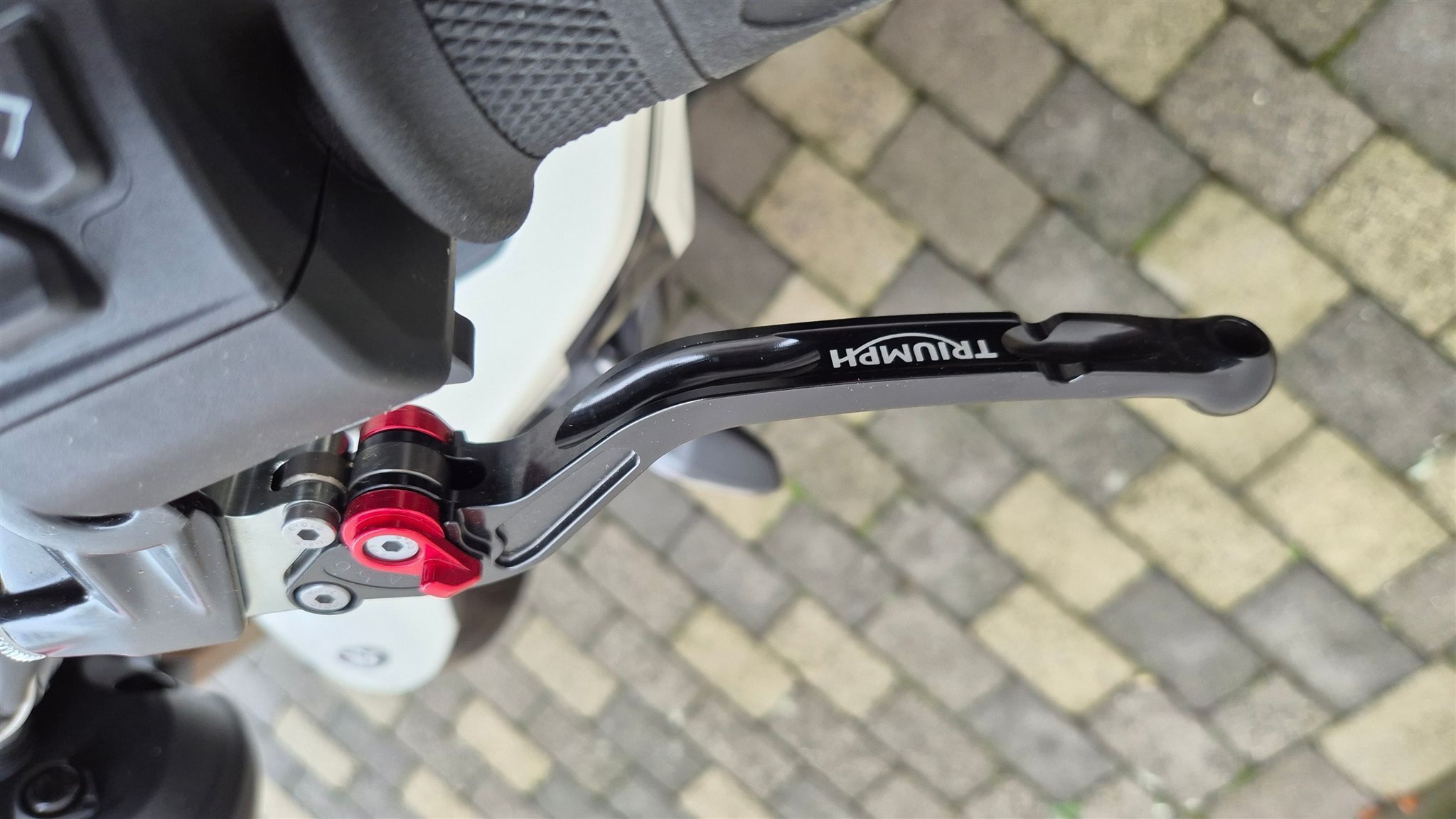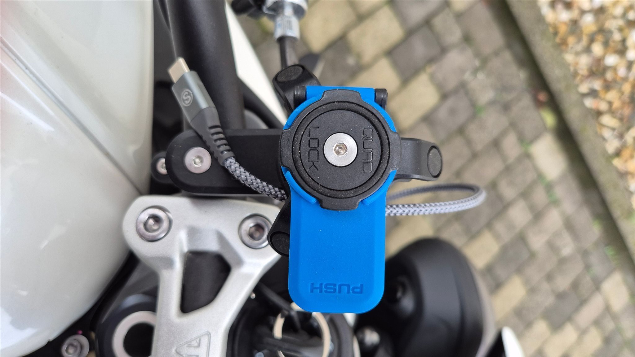 - Außerdem wurde eine Handyhalterung mit Vibrationsdämpfer der Marke Quad Lock verbaut. Ein Ladekabel wurde von Triumph zum Lenker gelegt.