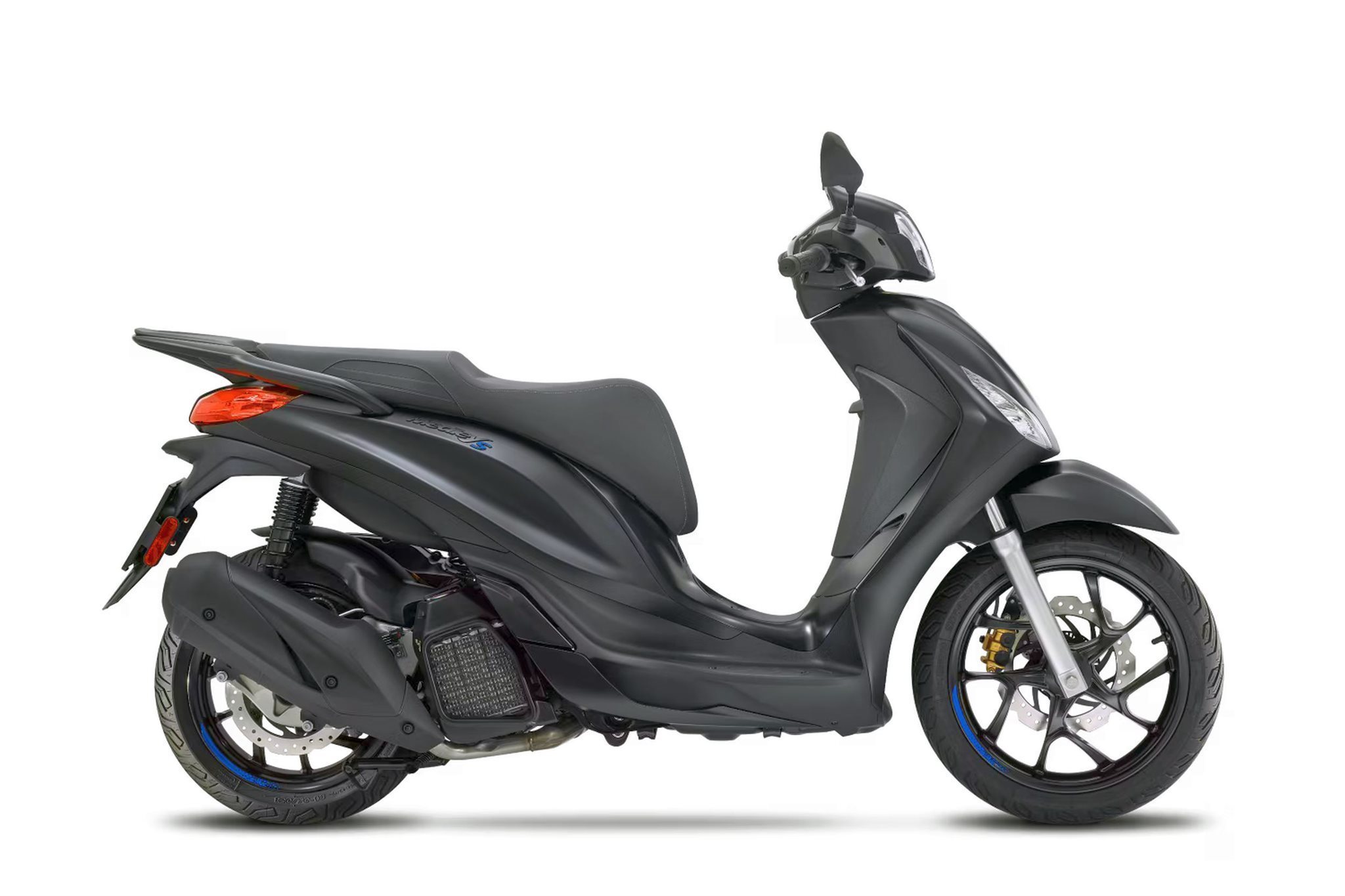Der sportliche Charakter des Piaggio Medley S zeigt sich in seinem markanten und eleganten Design , das durch die bis ins Detail schwarze Lackierung , kontrastierende blaue Felgenaufkleber und den unverwechselbaren Wabengrill unterstrichen wird. Die elegante und schützende Frontpartie sowie die schlanken Linien des Hecks schaffen eine perfekte Balance zwischen Sportlichkeit und Funktionalität . Tiefe Töne und matte Farben betonen die selbstbewusste Persönlichkeit des Piaggio Medley S, der auf jeder Fahrt seinen Stil voll entfalten kann.