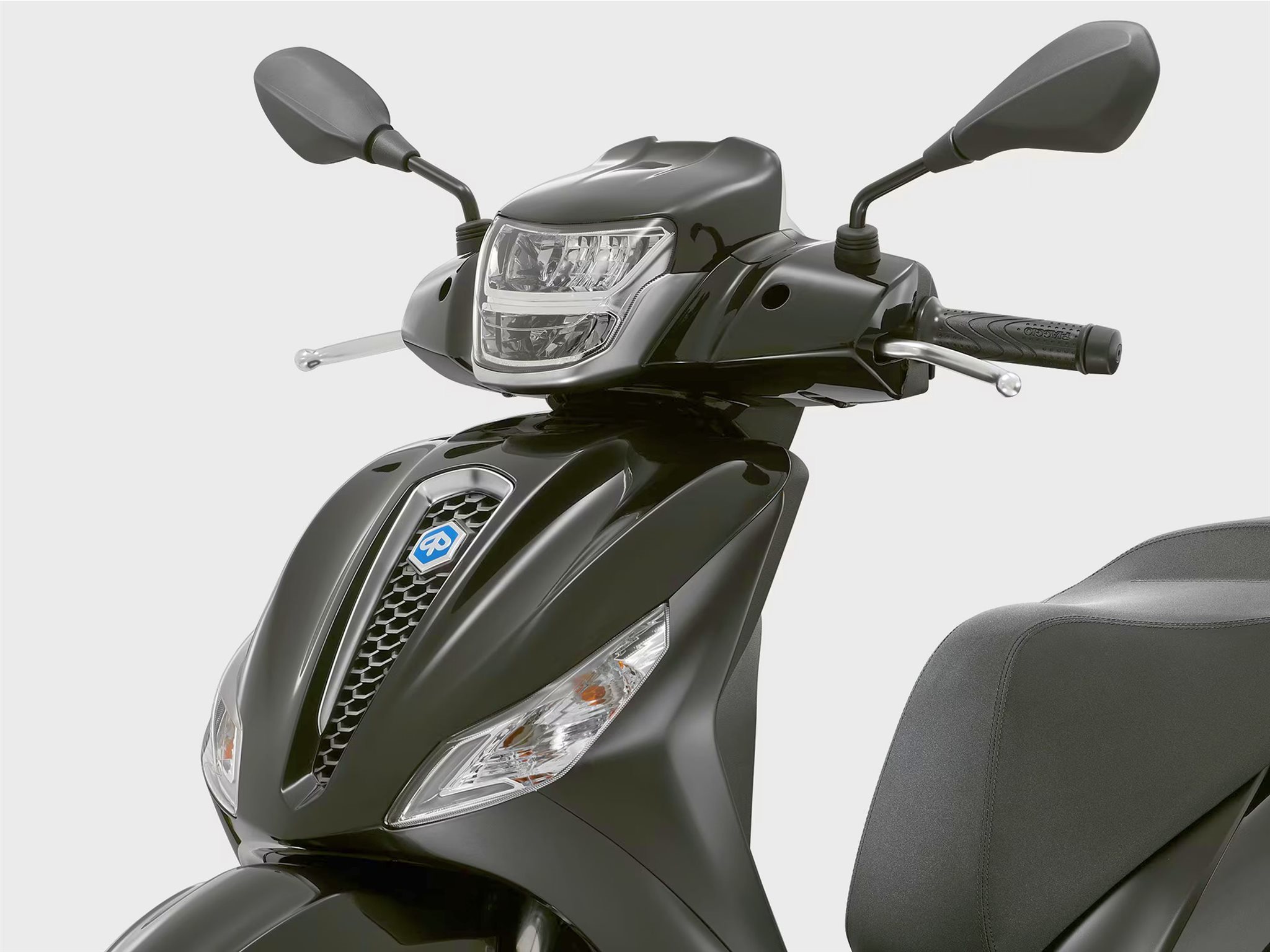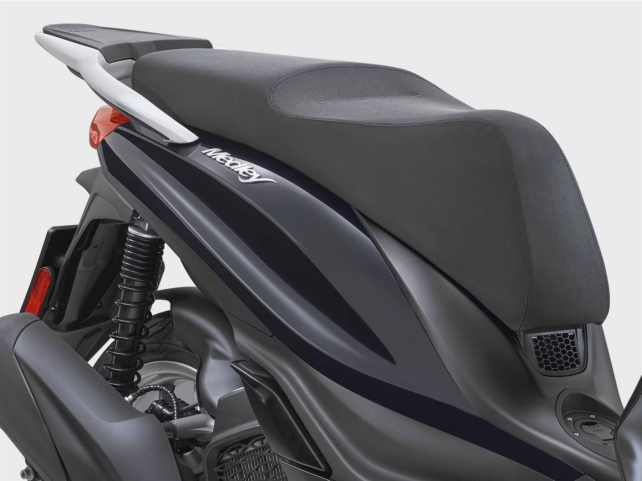 Die Piaggio Medley zieht alle Blicke auf sich. Die Front wirkt elegant und schützend, während die dynamischen Linien des Hecks Schwung und Leichtigkeit vermitteln. Die klassischen und edlen Farben finden sich auch in den Details des Sattels wieder, der großzügig dimensioniert und selbst für den Beifahrer komfortabel ist . Die aluminiumfarbenen Applikationen an Felgen und Haltegriff unterstreichen in Kombination mit dem schwarzen Interieur den raffinierten und zugleich funktionalen Charakter der Piaggio Medley.