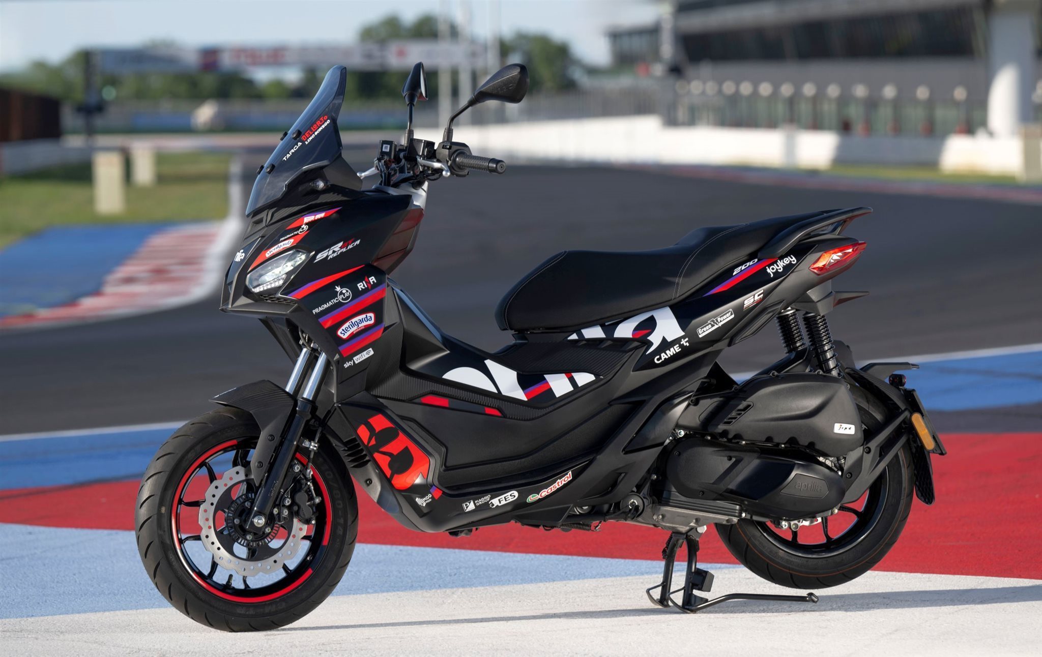 Die Sonderedition Replica zeigt stolz ihre vom Rennsport inspirierten Referenzen. Mit seiner auffälligen Optik, die sich durch eine mattschwarze Verkleidung mit roten und violetten Grafikelementen auszeichnet, macht der SR GT keinen Hehl daraus, dass er von der RS-GP25 inspiriert ist. Der Soziusgriff und der Spoiler sind ebenfalls in Mattschwarz gehalten, während das ikonische Aprilia Logo an der Seite prangt.